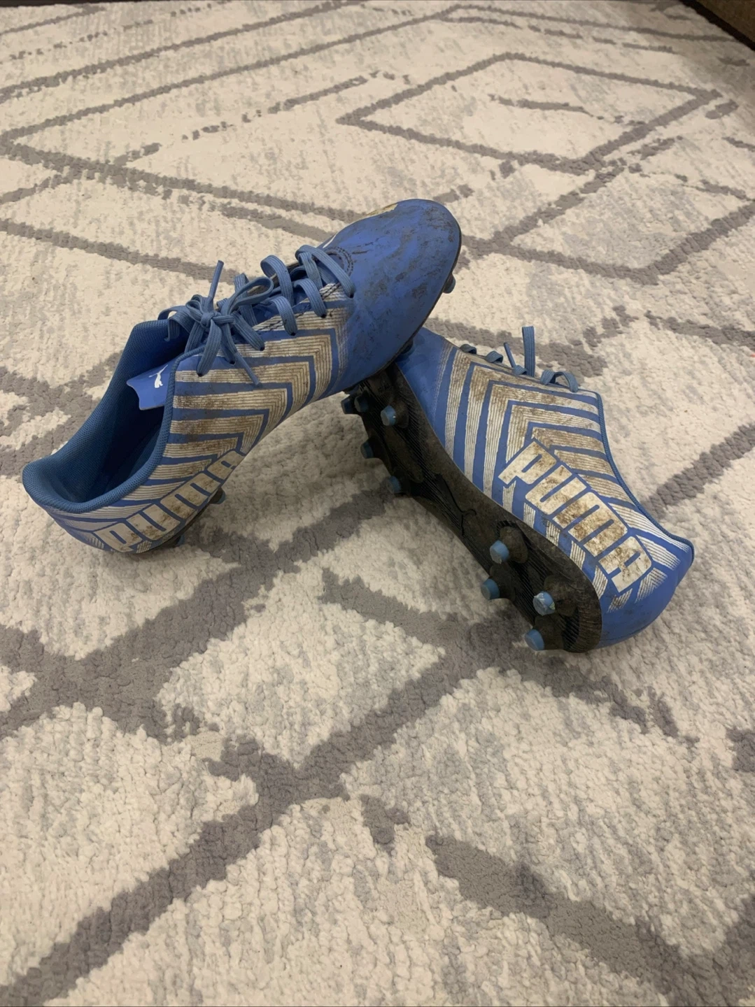 These Puma TACTO II FG/AG soccer cleats are a size 9.5 in dusky blue-puma white. They're designed for firm ground or artificial grass play. These cleats are ready for the field!