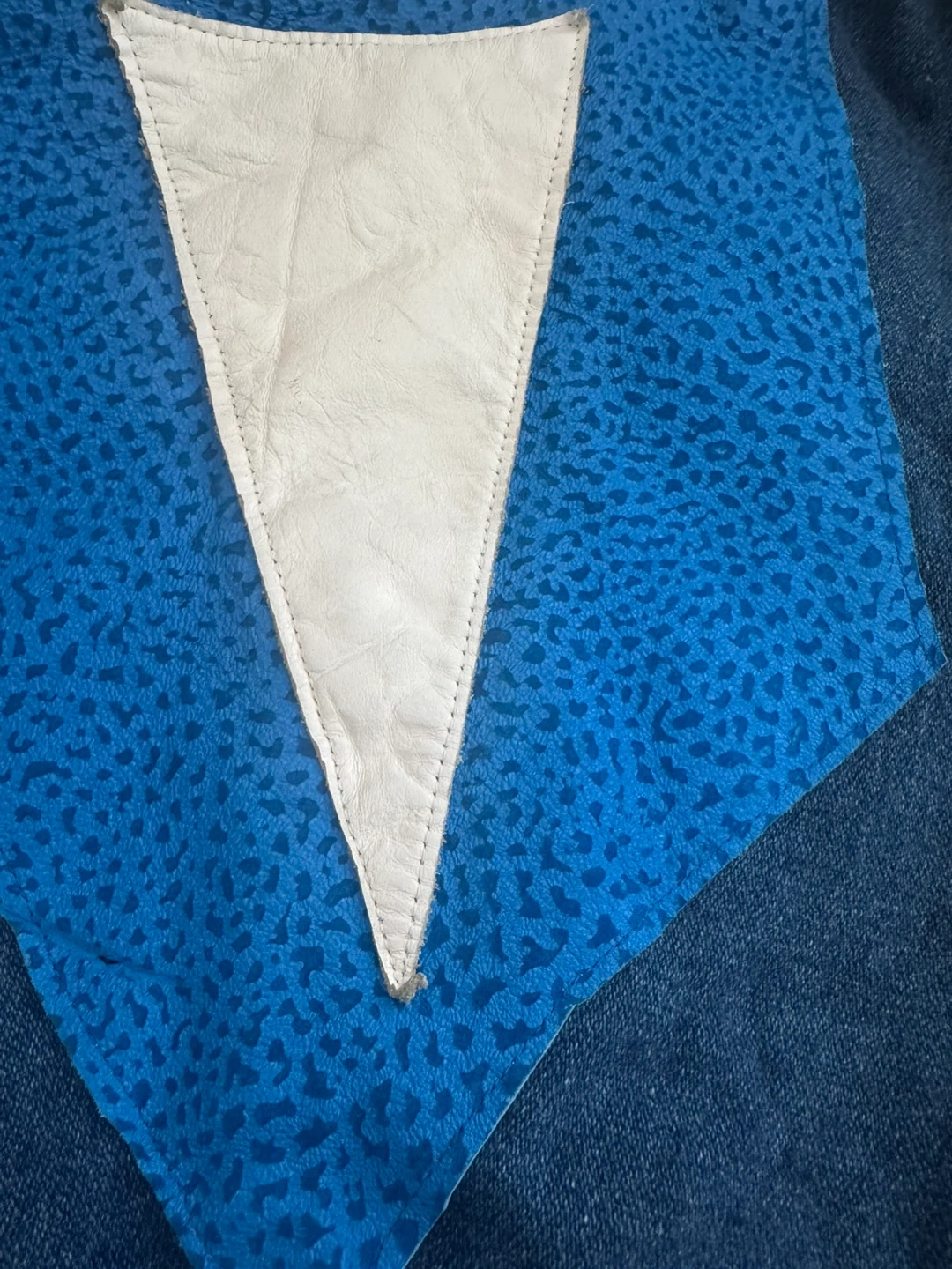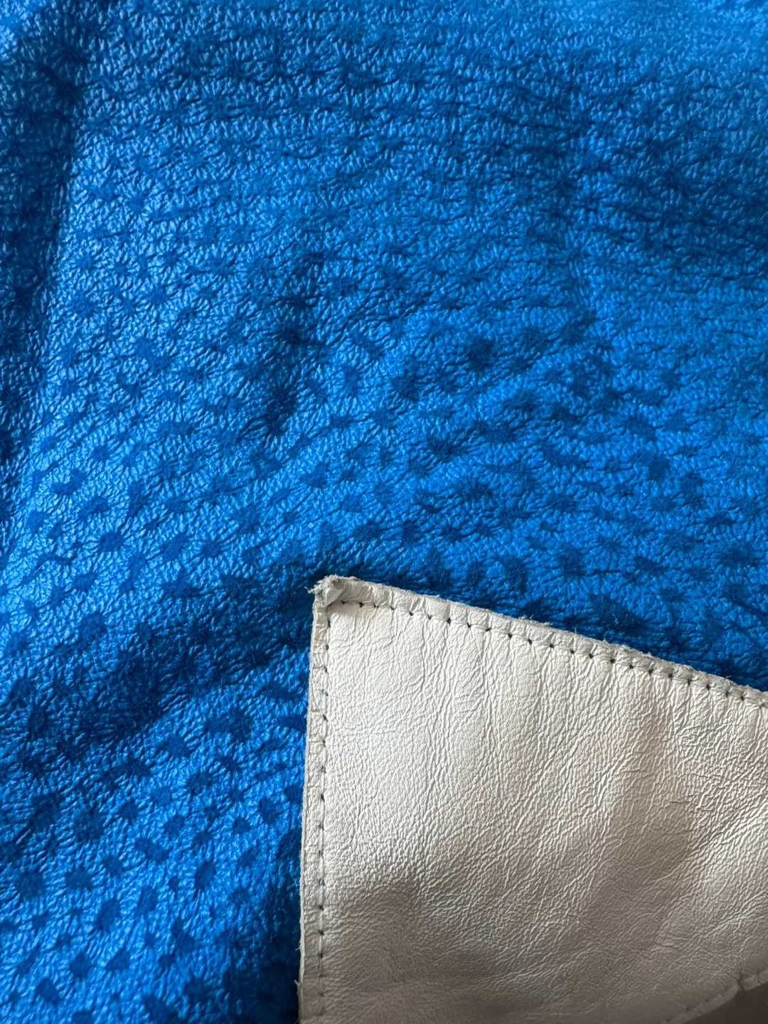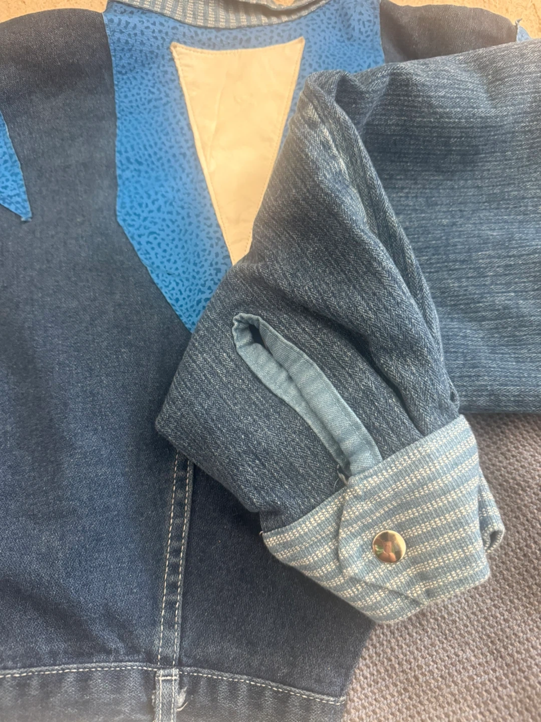 • Design: Multi-panel construction combining light and dark denim, waffle-knit, and cobalt textured fabrics.