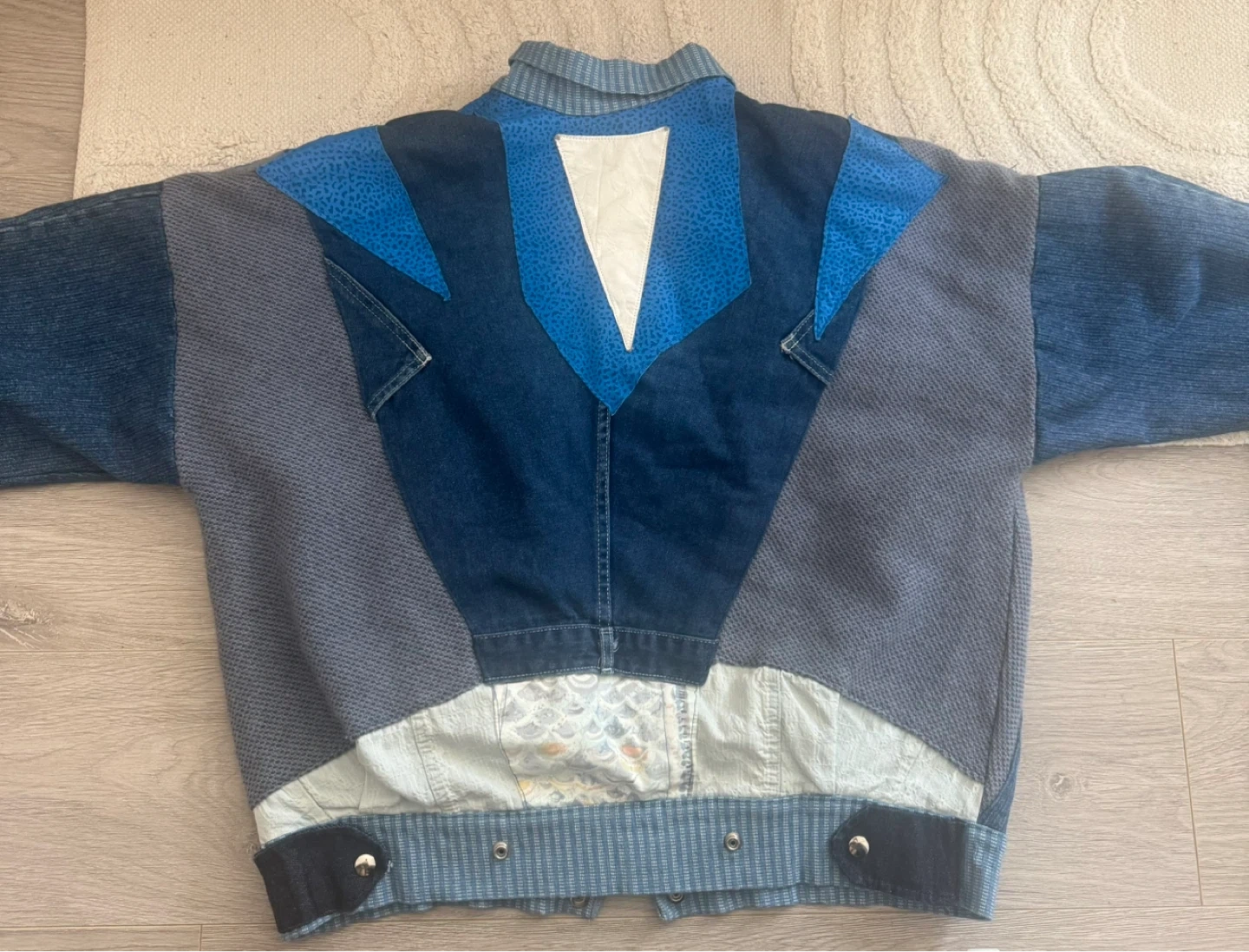 This is a 90s vintage upcycled patchwork denim jacket features a bold 90s streetwear aesthetic with a wide, boxy fit.