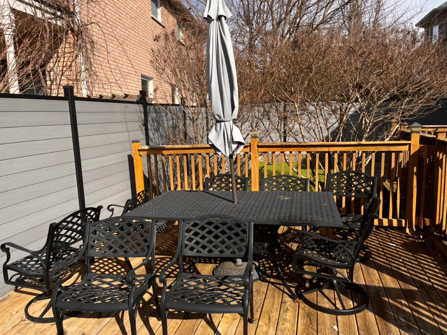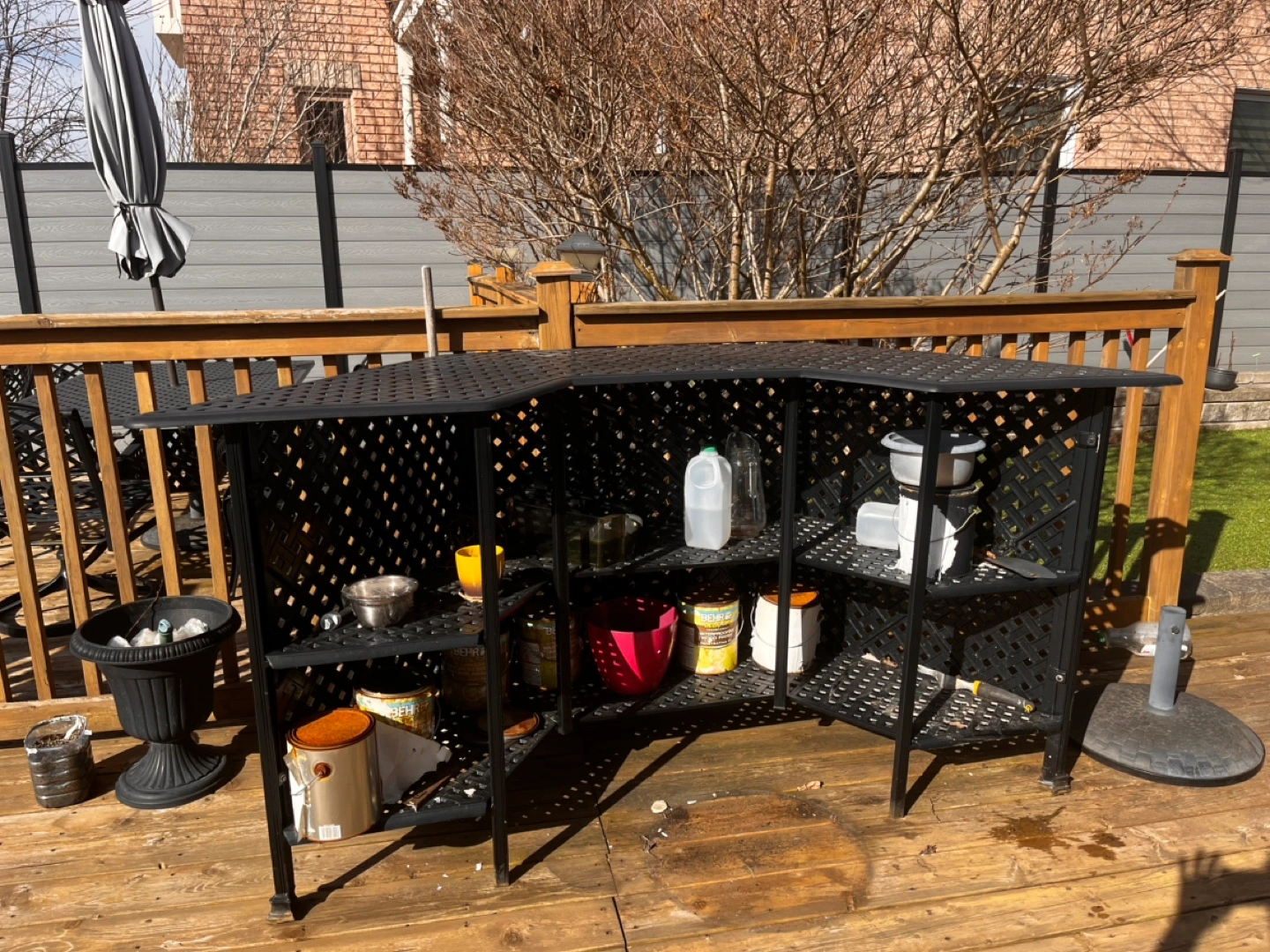 Black metal outdoor patio bar. Multiple shelves for storage. One Table and 8 chairs and one beach umbrella , Perfect for entertaining.