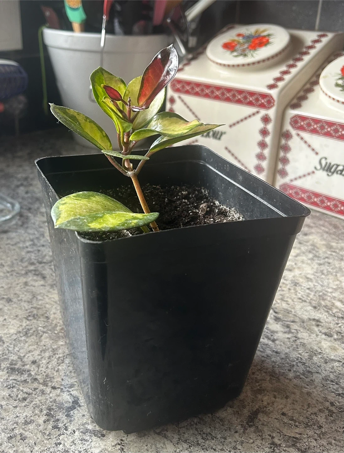 This is a Hoya Carnosa Tricolor plant in a black nursery pot. It's a lovely houseplant with variegated leaves. It comes potted with soil and ready for a new home!