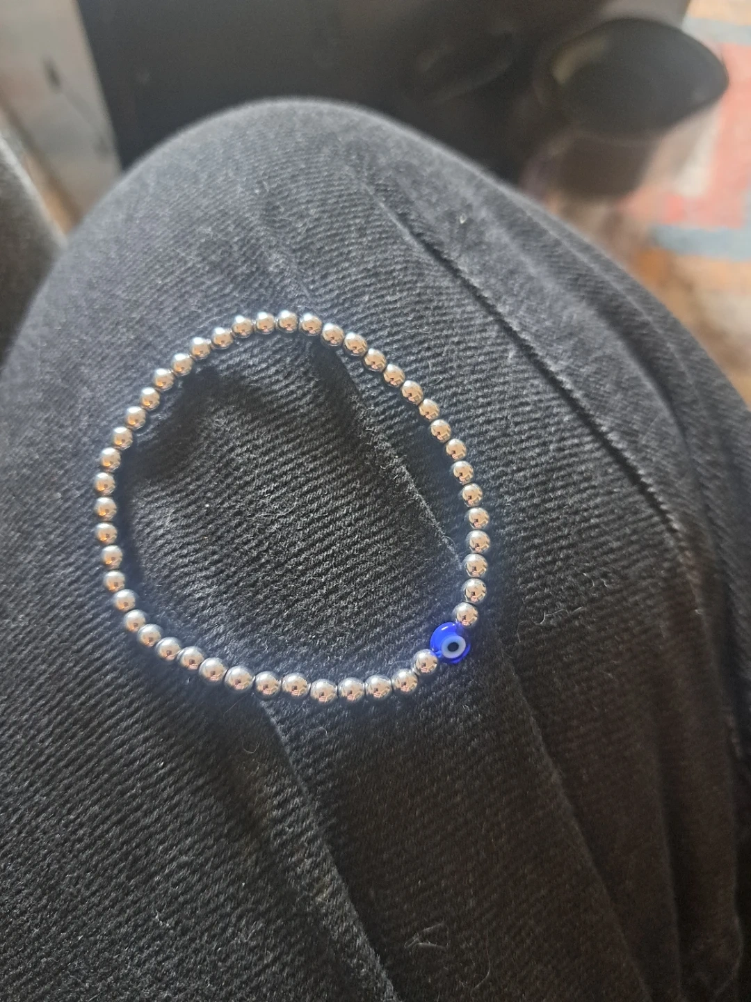 Simple beaded bracelet with small silver beads. Features a blue evil eye charm for protection. Stretchy band for easy wear.