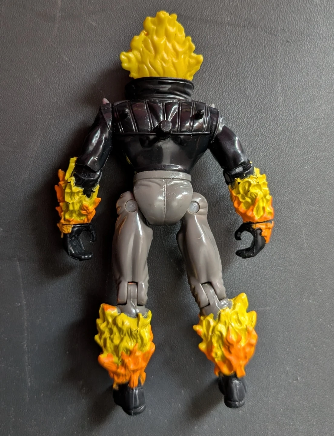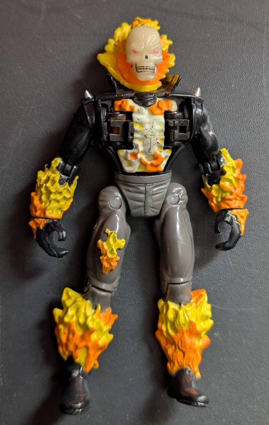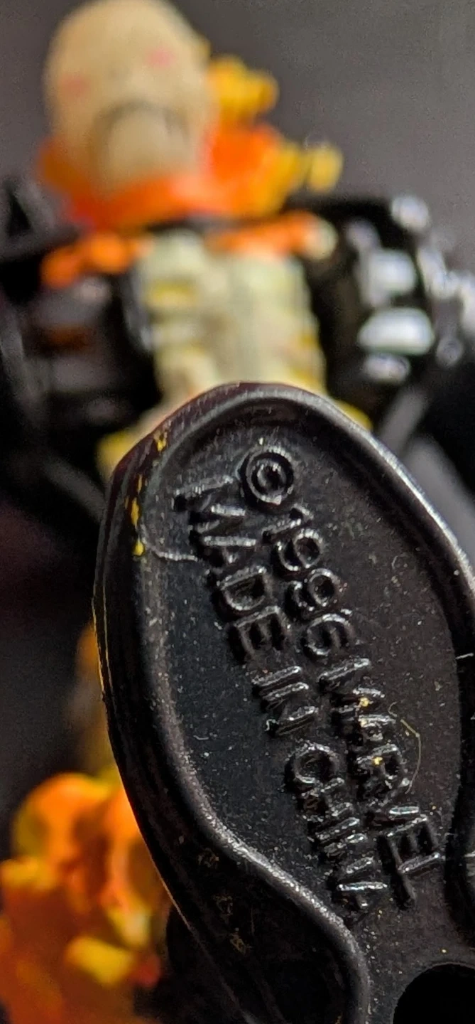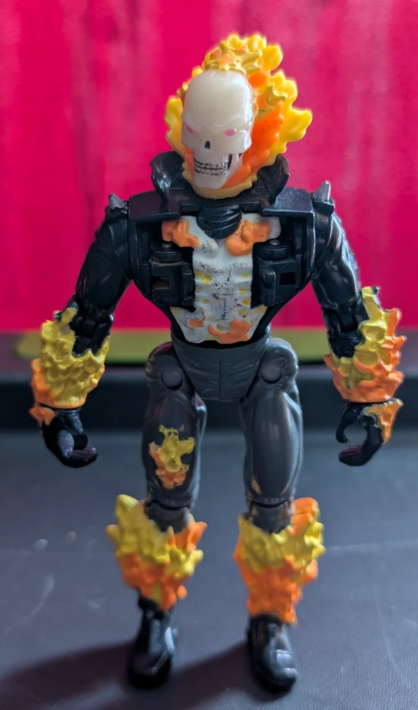 This is a 1996 Ghost Rider action figure. It's made in China and features flame detailing on its arms and legs. The skull head has a flaming effect. The skull also glows in the dark. It's a cool collectible for fans!