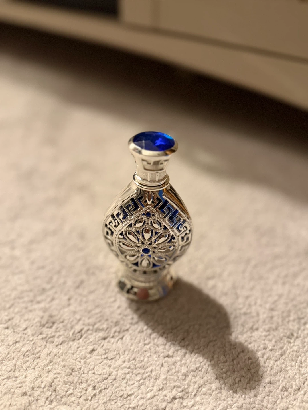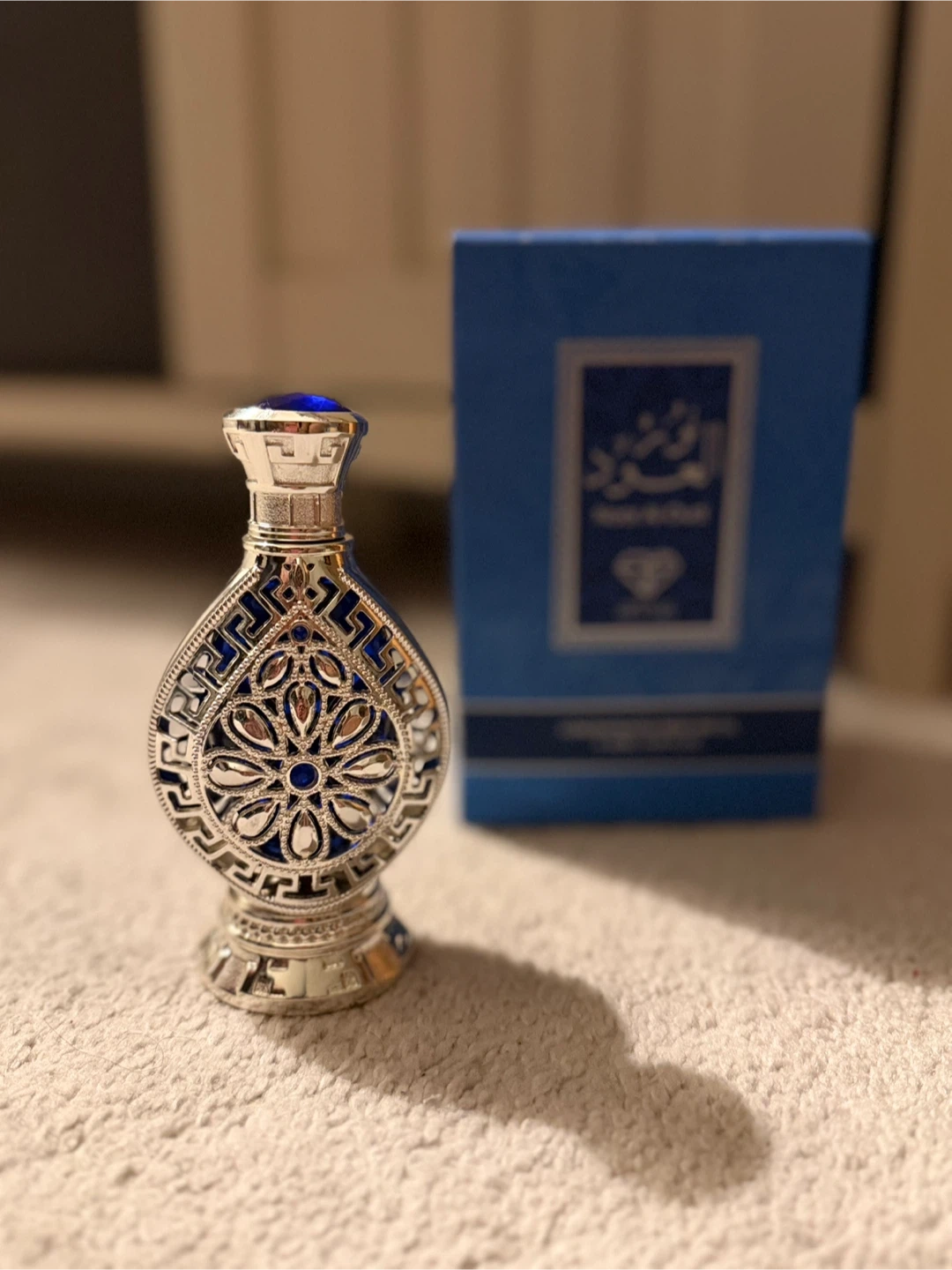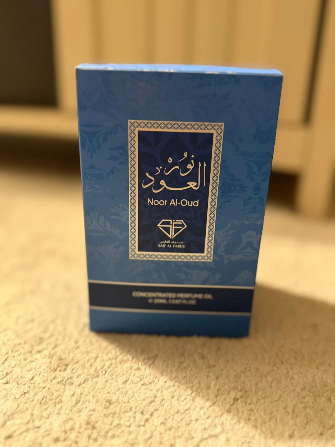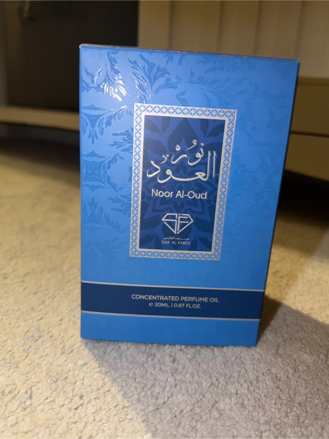 This is a 20ml bottle of Saif Al Fares Noor Al-Oud concentrated perfume oil. It comes in an ornate silver and blue glass bottle with a decorative metal casing. The perfume oil is presented in its original blue box.