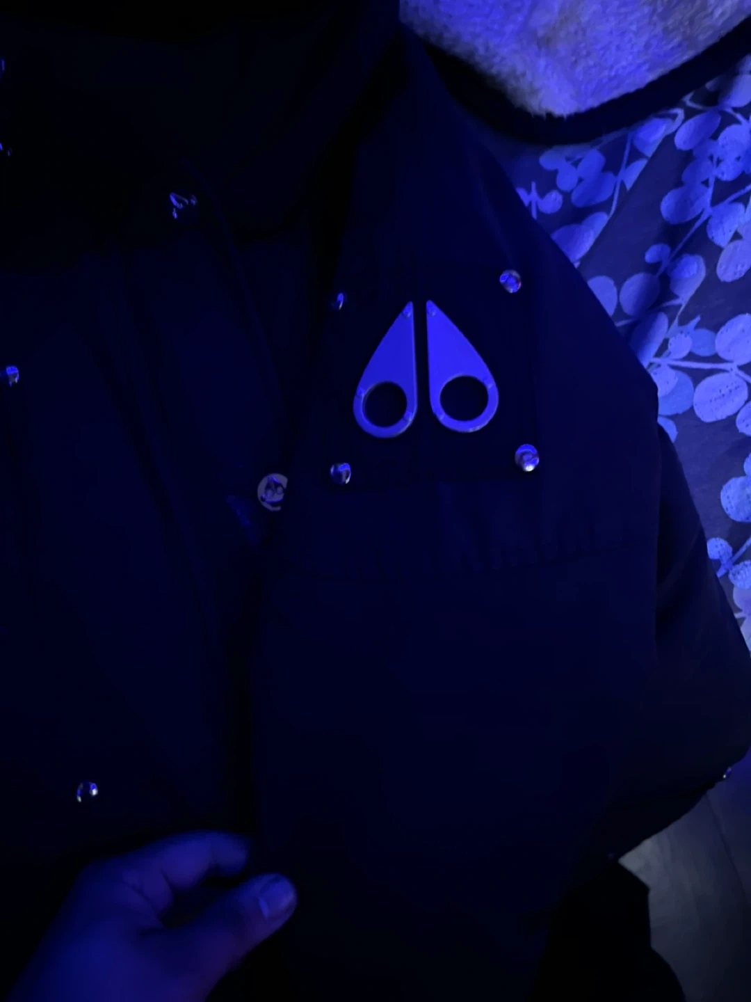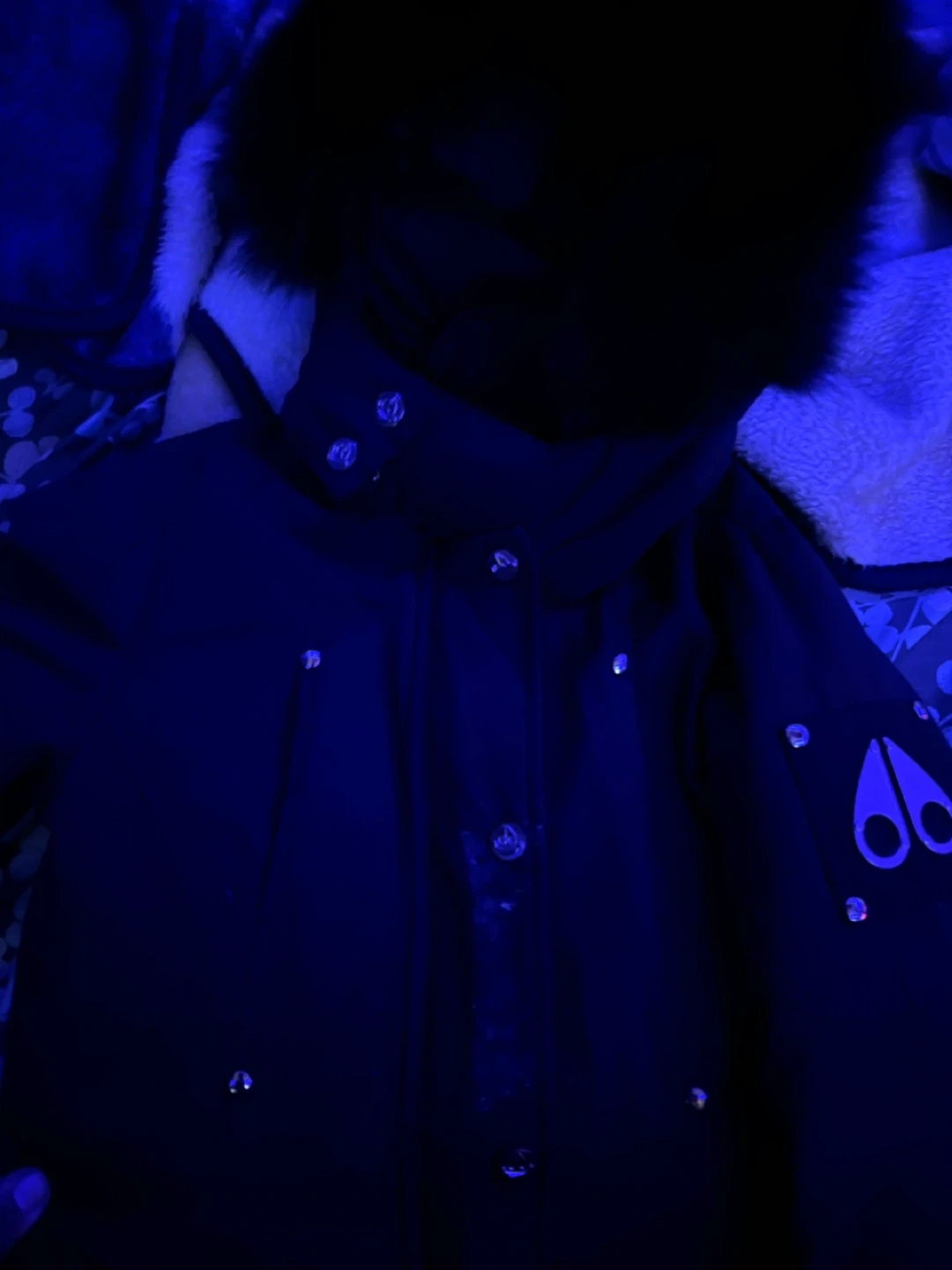 This is a Moose Knuckles black jacket featuring a fur-lined hood. It's a stylish and warm outerwear piece for colder weather. Zipper closure with snaps for extra security.