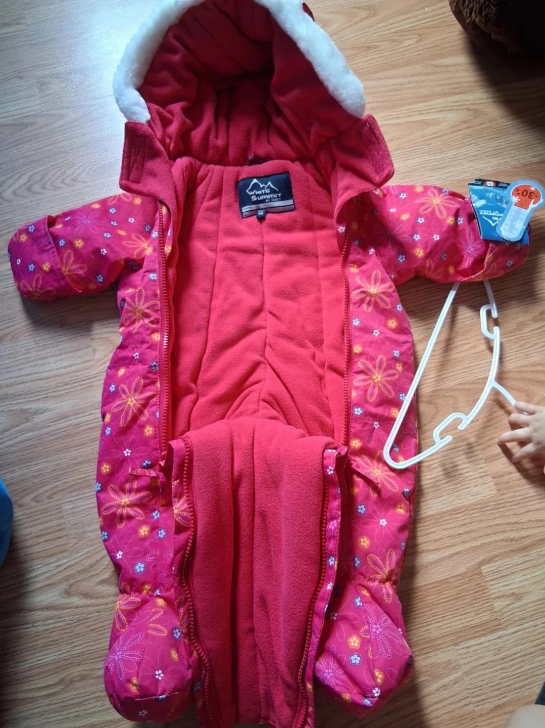 This pink floral snowsuit is from White Summit. It features a cozy fleece lining and a faux fur-trimmed hood for extra warmth. The full zip front makes for easy dressing. Built to keep little ones warm during winter outings!