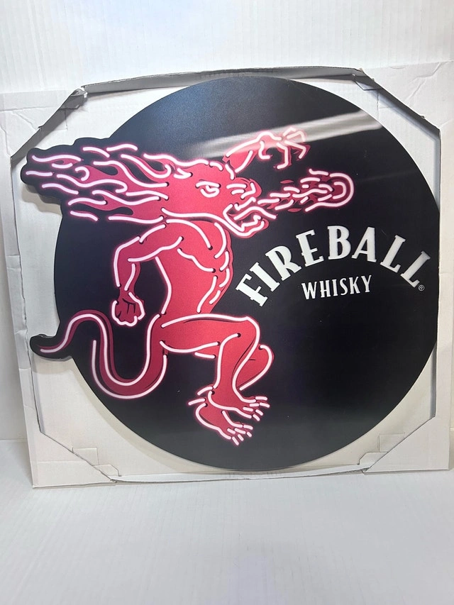 Spice up your home bar or collection with this vibrant Fireball Whisky sign! This sign is new, never used, and features the iconic Fireball dragon in a fiery red. Perfect for adding a touch of fun to any space. This whimsical piece is looking for a new home, and if the ad's still up, it's still available! Cash accepted.