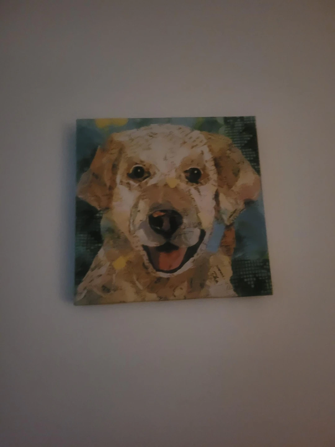 Add some charm to your walls with this delightful canvas art. It features a happy-looking Golden Retriever, rendered in a textured collage style. Perfect for any dog lover's home!