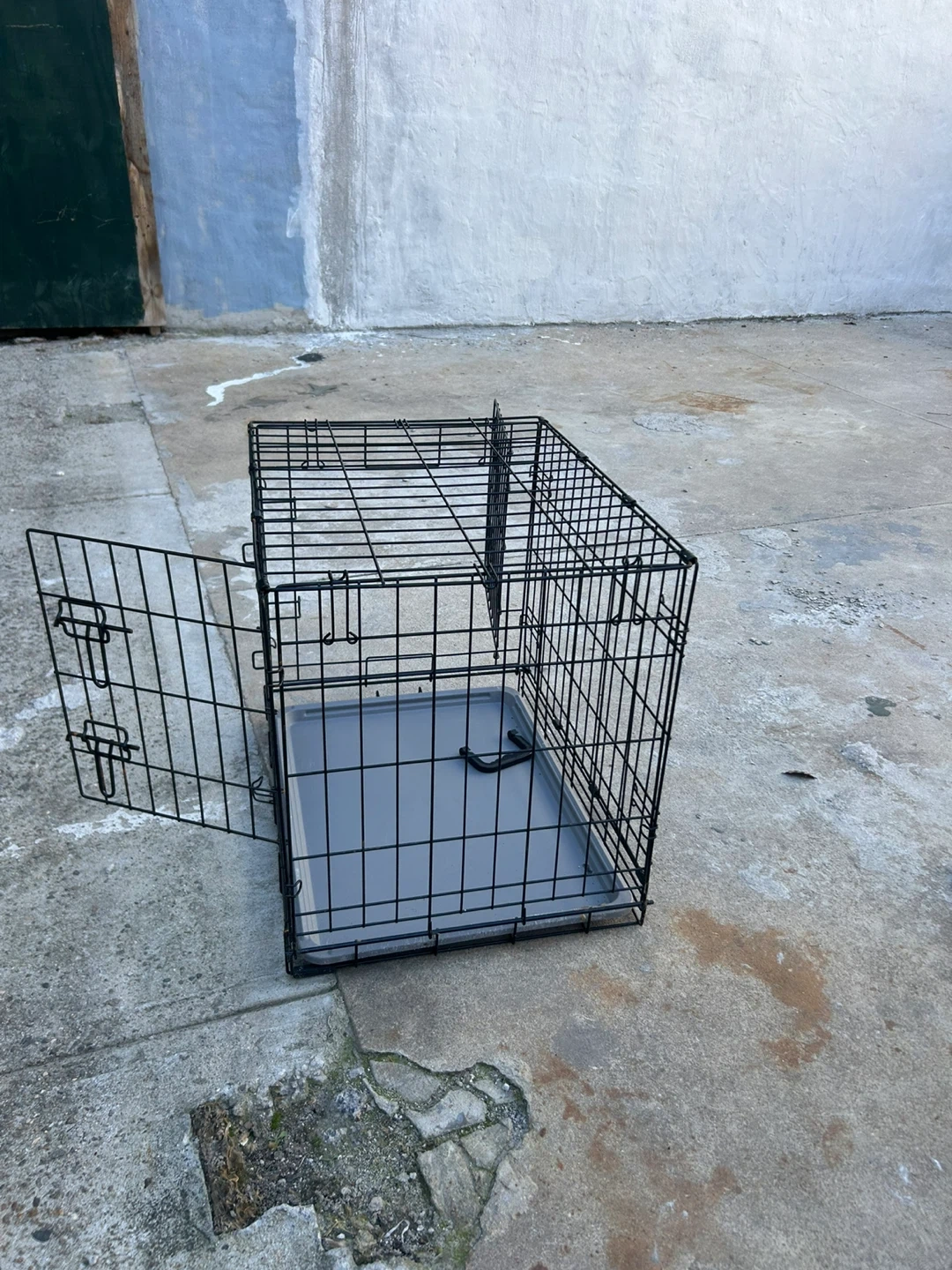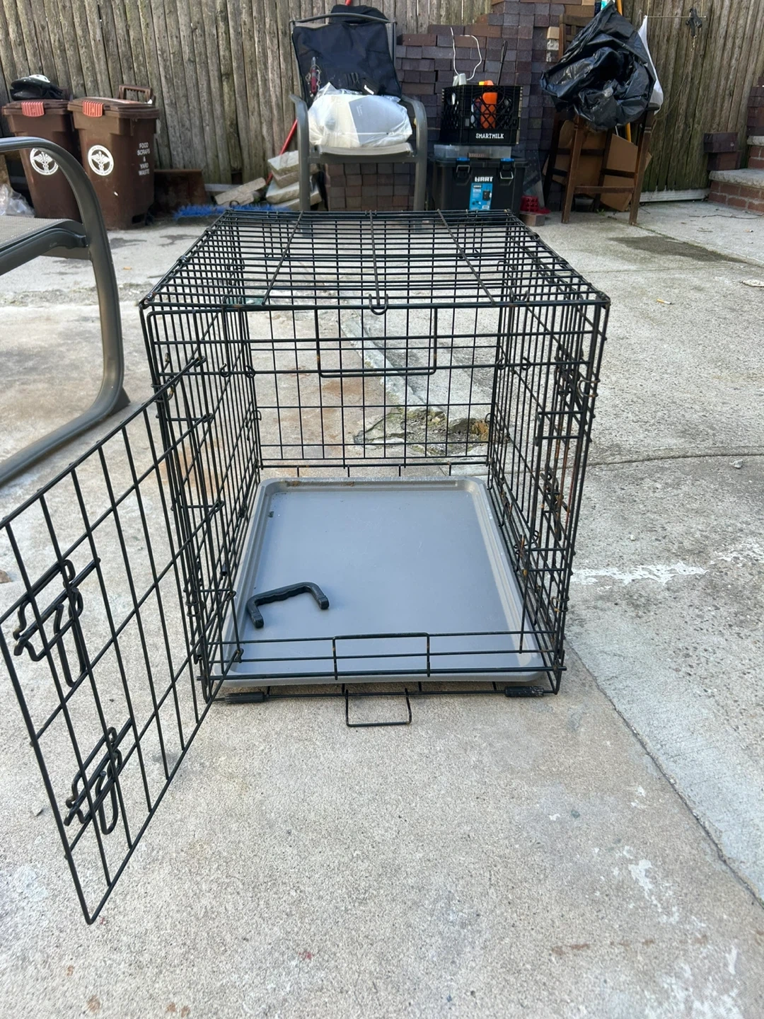 This is a black wire dog crate with a removable plastic tray. It features two doors for easy access and a sturdy wire construction. It's a practical enclosure for pets.