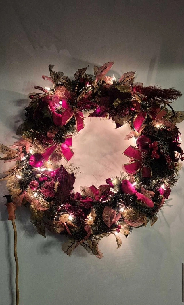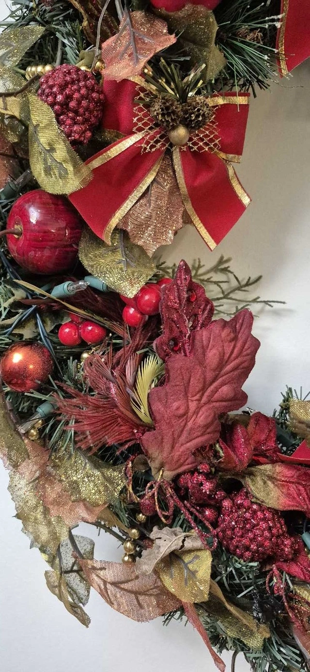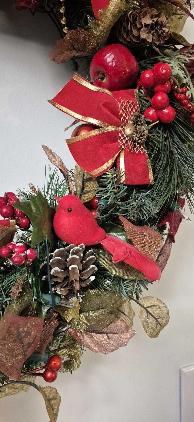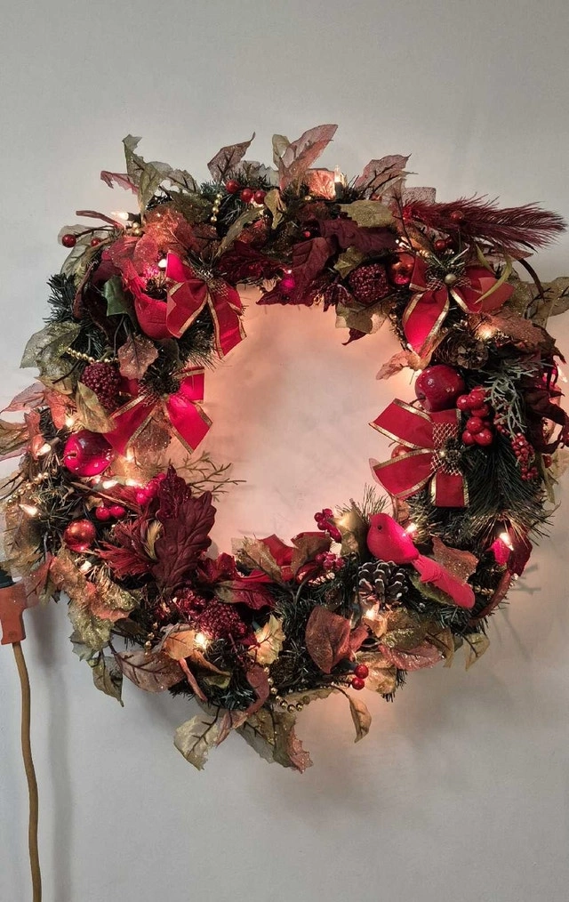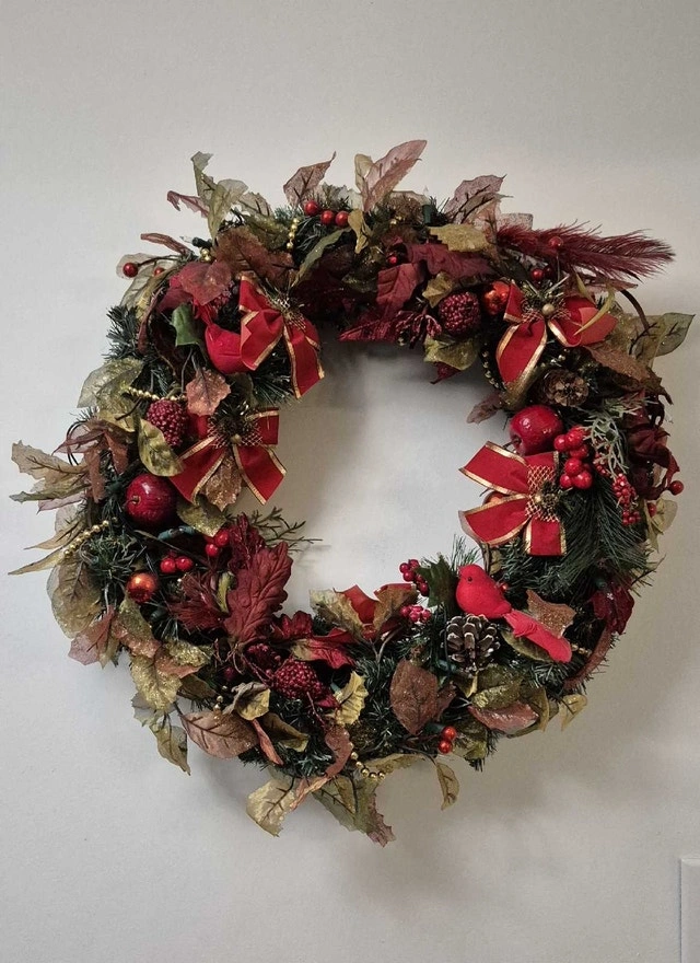 This is a beautiful pre-lit, handcrafted Christmas wreath featuring a mix of artificial green pine needles, burgundy glittered poinsettias, ornaments, and sprays, plush cardinal, red berries, pinecones, large bows with velvet embroidered ribbon, red berries, and decorative leaves. Garland size is 20" in diameter. Cash on pick up from Waterdown or Burlington.