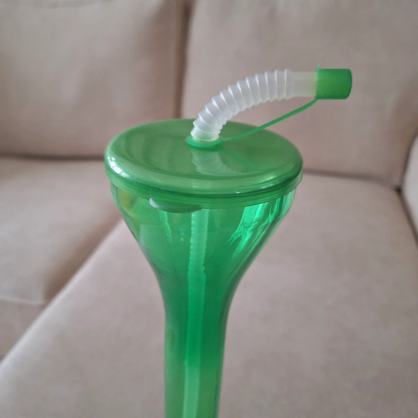 A fun green novelty tumbler cup. It comes with a lid and a bendable straw for easy sipping. This plastic cup is great for parties or everyday use!