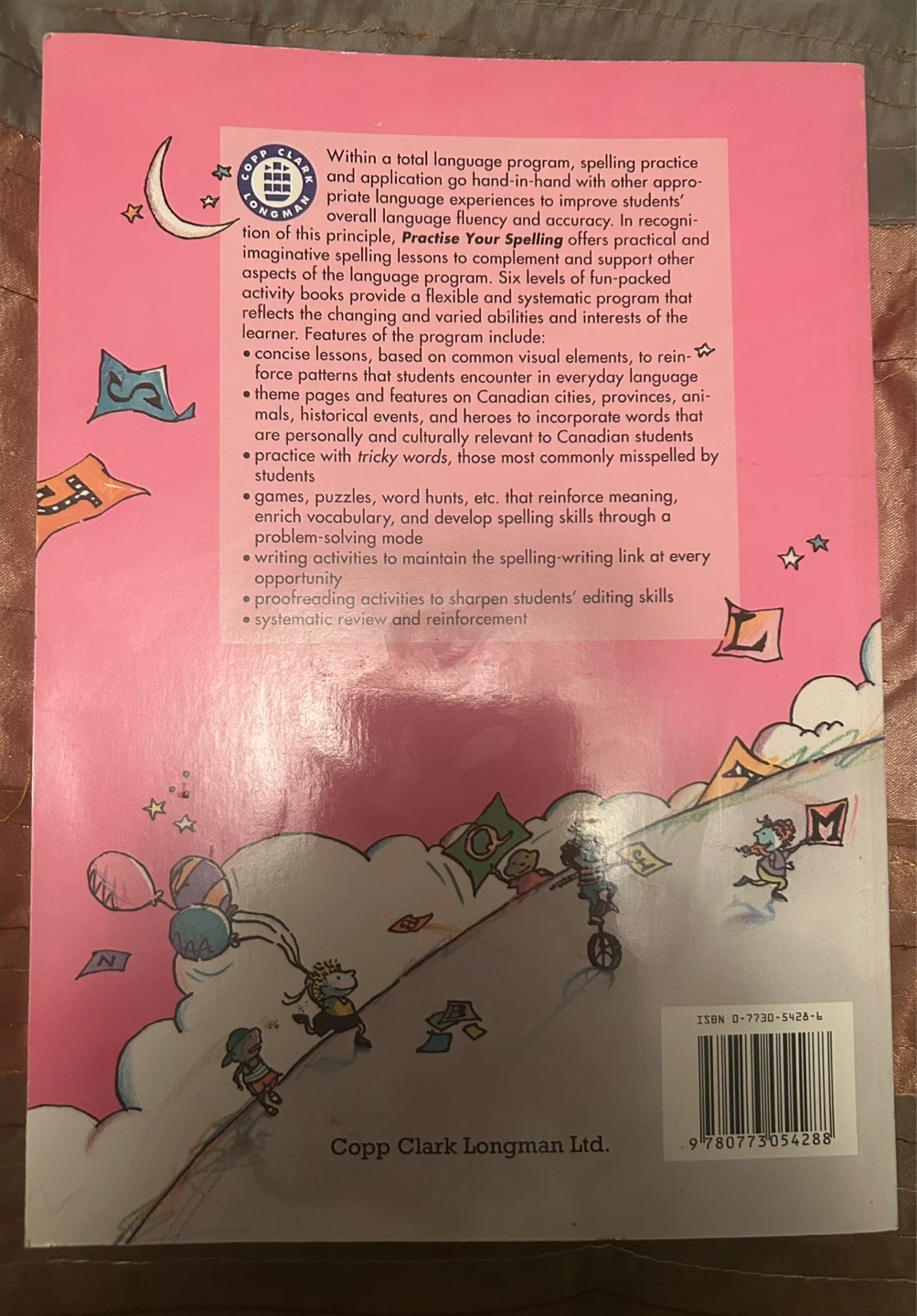 This activity book is part of a total language program for hand-in-hand learning. It focuses on spelling practice with lessons designed to improve fluency and accuracy. Features include engaging content with Canadian themes, puzzles, and word hunts.