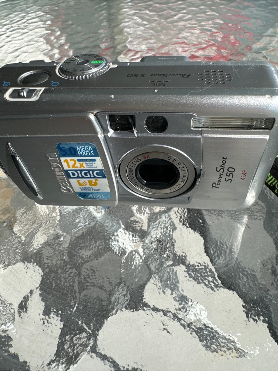 This Canon PowerShot S50 is a digital camera. It features 5.0 mega pixels and 12x optical zoom with DiG!C technology. It's silver in colour.