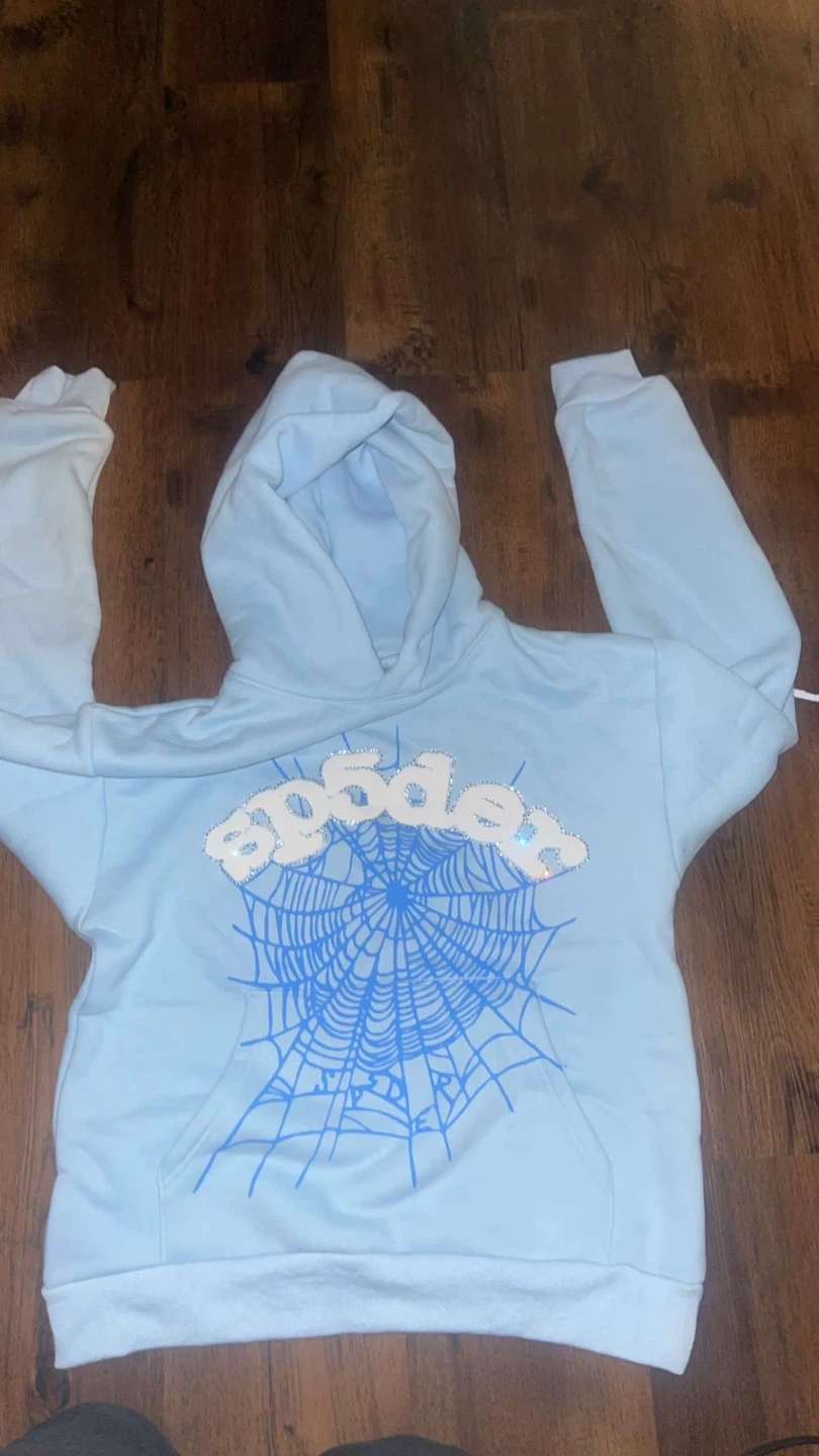 This is a light blue Sp5der hoodie. It's made from 100% cotton. The size is small. Includes original packaging.