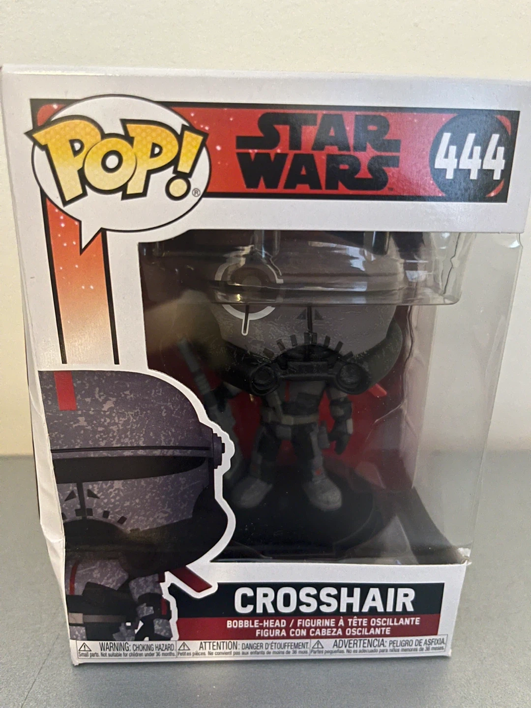 This is a Funko Pop! vinyl figure of Crosshair from Star Wars: The Bad Batch. It's character number 444 in the series. The figure comes in its original box.