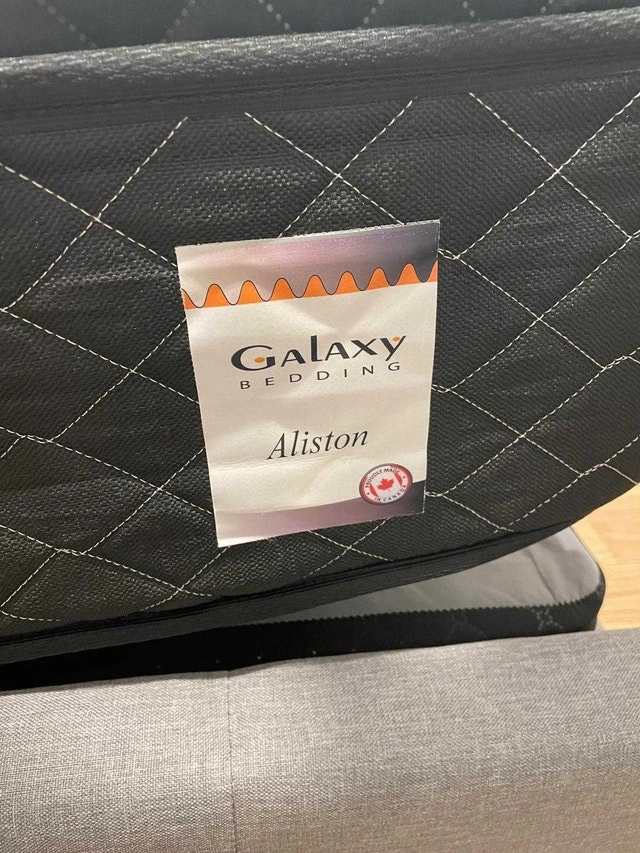 This is a Galaxy Bedding Aliston mattress, and it's ready to bring comfort to your bedroom. It is in used condition, but has lots of life left. Its supportive design ensures a restful night's sleep. * Brand: Galaxy Bedding * Model: Aliston * Size: Double * Condition: Like new Hi-Loft G1008 Pocket Coil Spring 800 Coils 360 Degree foam encased perimeter Natural content foam reducing your carbon footprint 1.8lbs High density comfort foam Cool gel comfort layer Swivel soft double jersey fabric Ultrasonic embossed border with non-slip support If you're seeing this ad, the mattress is available for purchase. Get ready to upgrade your sleep game!