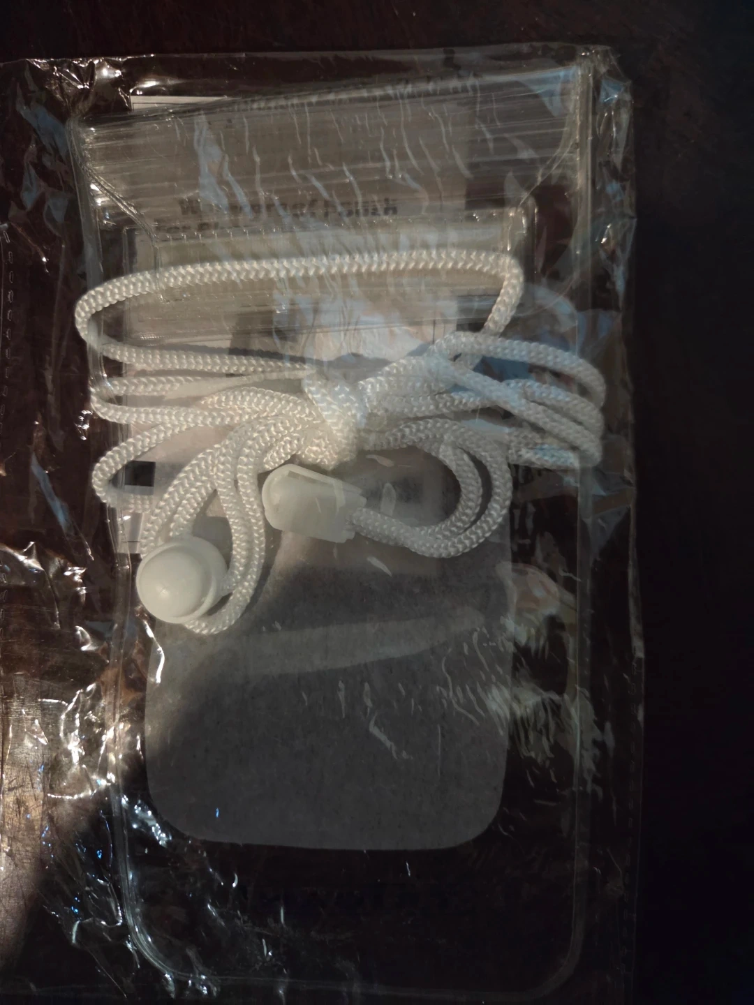 This is a waterproof pouch designed to protect your belongings from water. It comes with a white lanyard for easy carrying. The pouch has a clear front and a grey backing, perfect for keeping items dry at the beach or pool. Have about 300 units $3 a piece