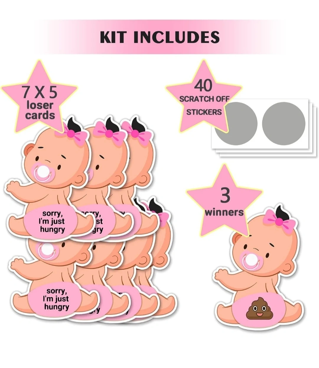 EXCITING AND EASY TO PLAY: Put the round scratch-off stickers on the cards. On the day of the event, just stick the card under the guest's chair or take it out when the guest comes in. Whoever reveal winner card is the winner! A perfect way to get your Baby shower started with lots of fun and laughter!