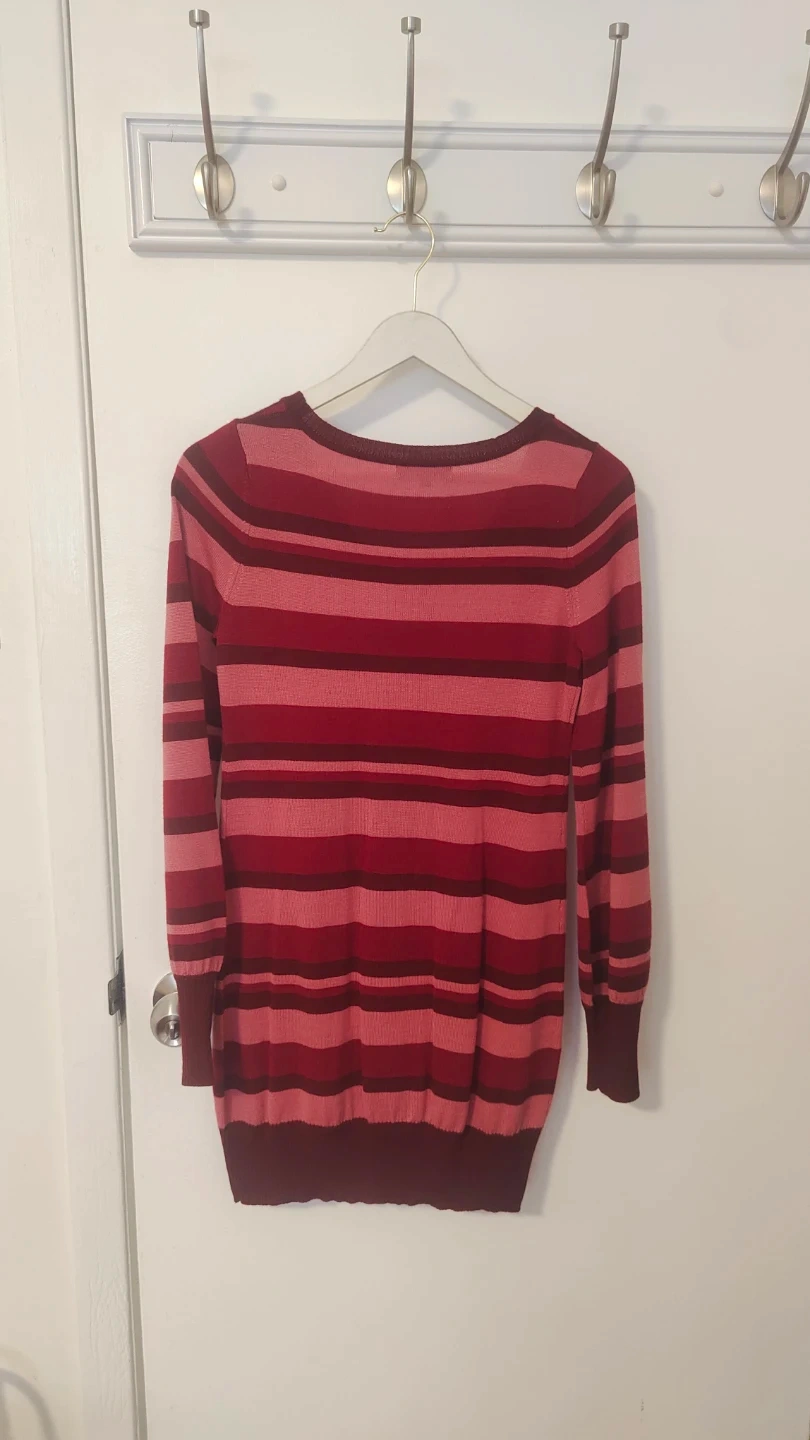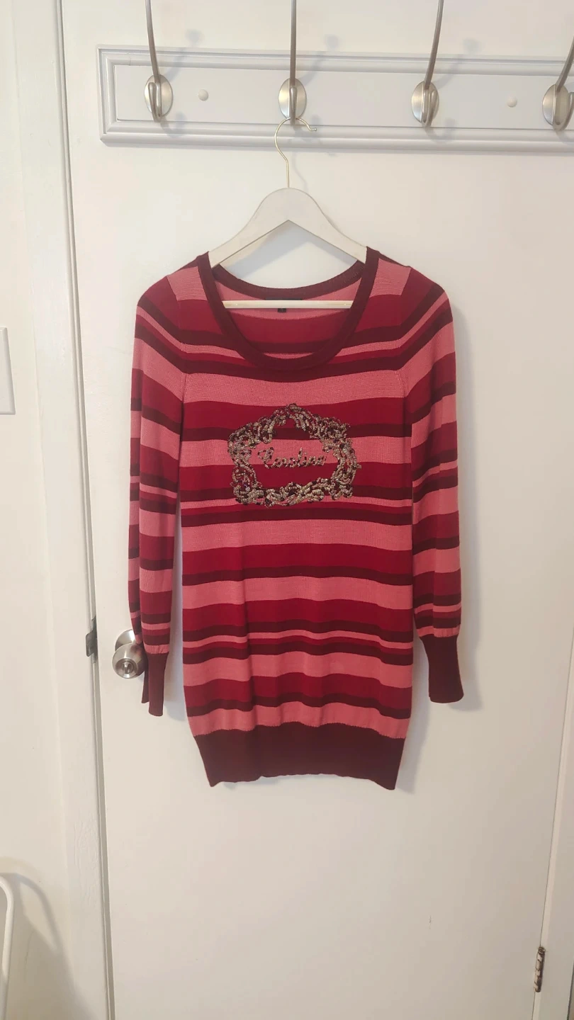 This Burberry sweater features a classic horizontal stripe pattern in shades of pink and maroon. It has a rounded neckline and 3/4 length sleeves. A decorative, jeweled emblem with the Burberry logo is on the front.
