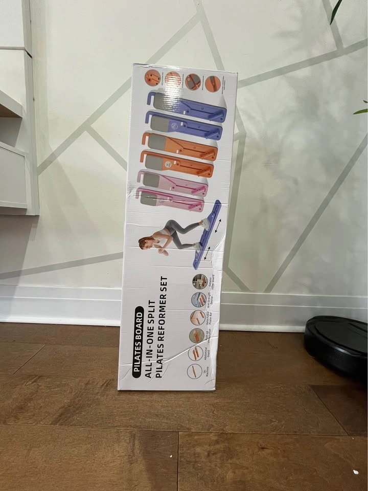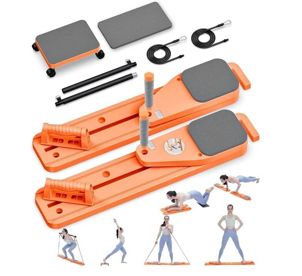 This is a new, open-box Pilates Board, a 12-in-1 Mini Pilates Reformer Set that's multifunctional and portable for home workouts. It comes in Cosmic Orange. You can customize your workout according to your needs, following the professional user manual. Combine freely according to exercise requirements (Pilates board + Fitness roller board, Multi Combination Handles + Resistance Bands, Detachable Pilates Bar + Resistance Bands, Fitness roller board + Universal pulley * 4). After recombination, it can form over 20 training forms, achieving over 100 targeted movements. You can combine two separate Pilates reformers pieces to form a single straight line, unlocking a simulated ski machine mode. The set can comprehensively exercise muscles of the back, abdomen, hips, arms, legs, pelvic floor, and enhance core strength. The board gradually adjusts resistance levels for different fitness goals. Made of high-quality polypropylene (PP) material with a maximum load capacity of 500 lb. It's wear-resistant, has better anti-oxidation performance, and a longer service life. Equipped with 20 silicone anti-slip pads for safety and stability. The high-precision silent bearing (<35 db) can withstand over 500,000 cycles. The integrated track design resolves the issue of wheels getting stuck. It comes with two independent adjustable plates. You can freely adjust spacing and angle according to your shoulder width and height, unlocking more exercise modes. A single set meets most fitness needs and can be used without tools. It integrates a simulated ski machine, pull-up/push-up stretch device, leg trainer, climbing machine, treadmill, plank board, shaping arm device, resistance bands, and upper body trainer.
