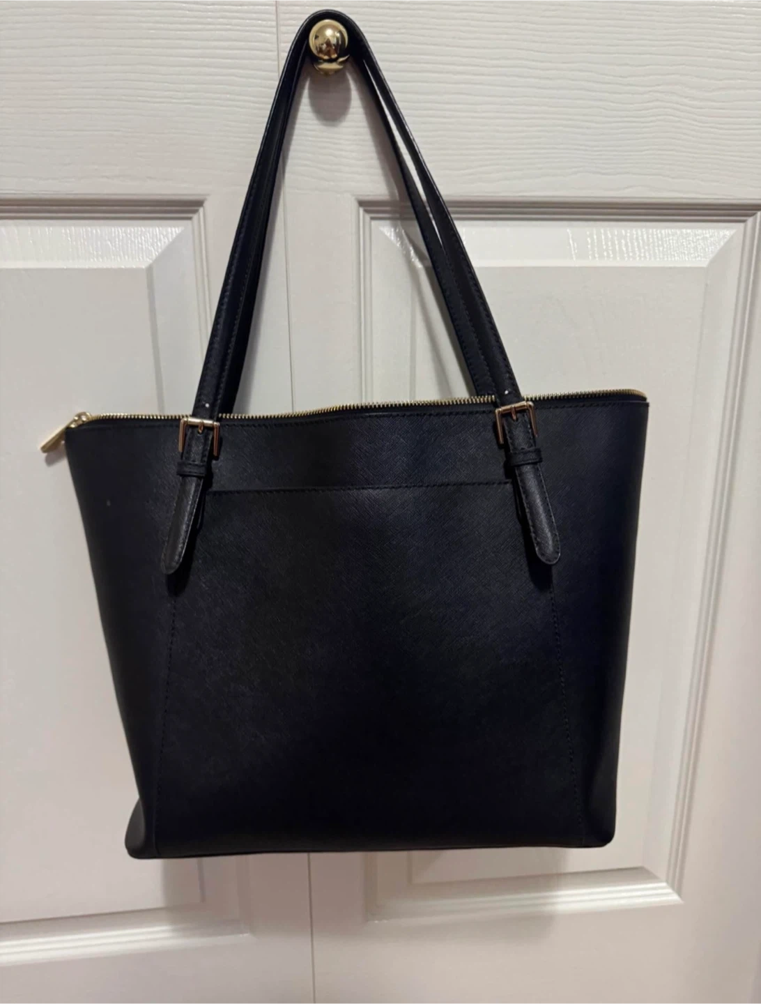 A classic black Michael Kors tote bag. It's made of saffiano leather and features a zip-top closure.