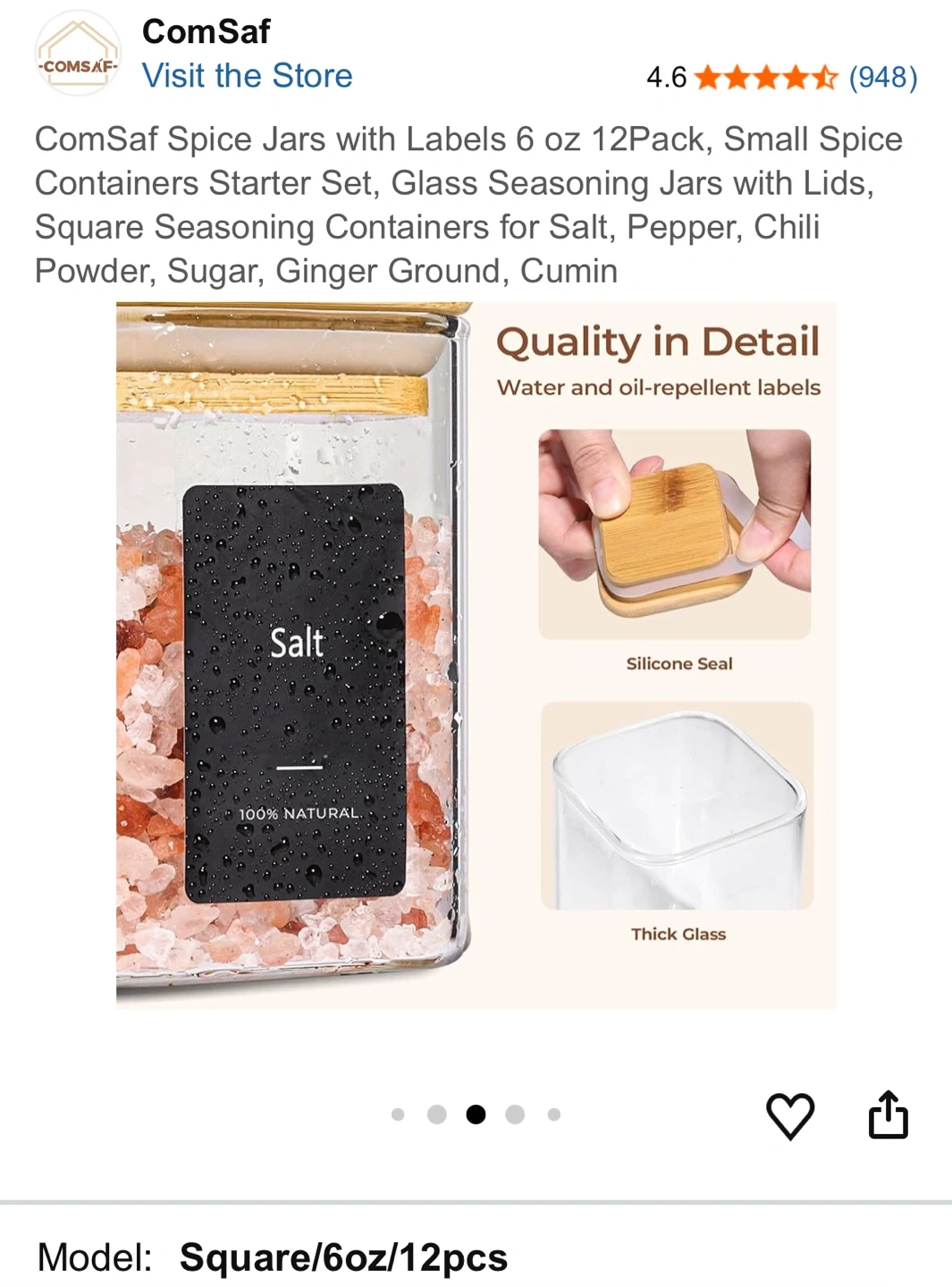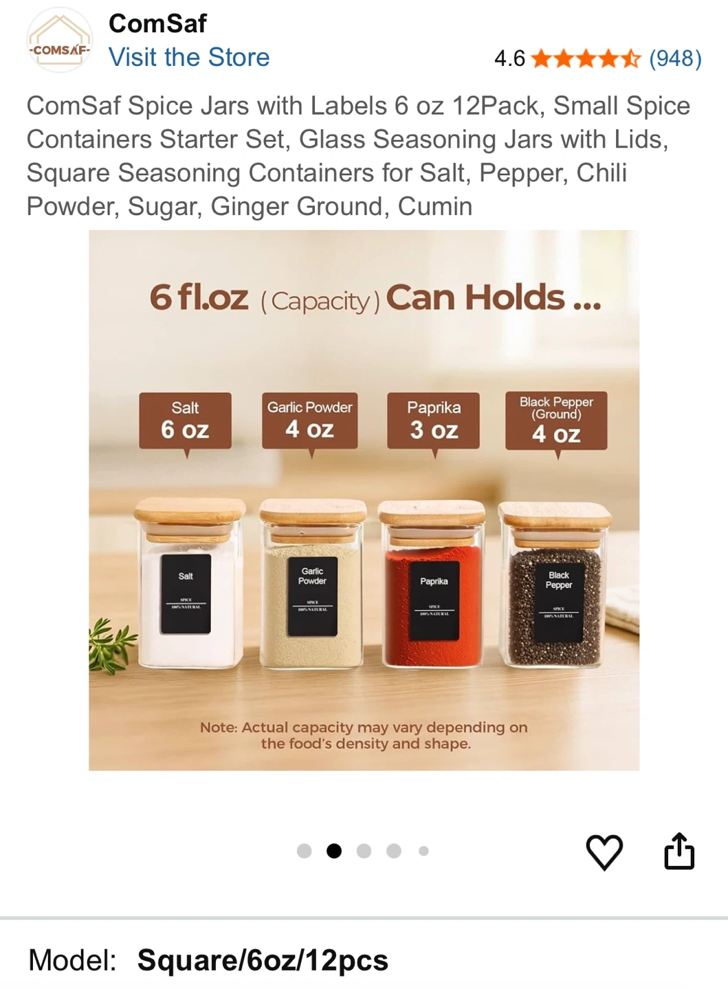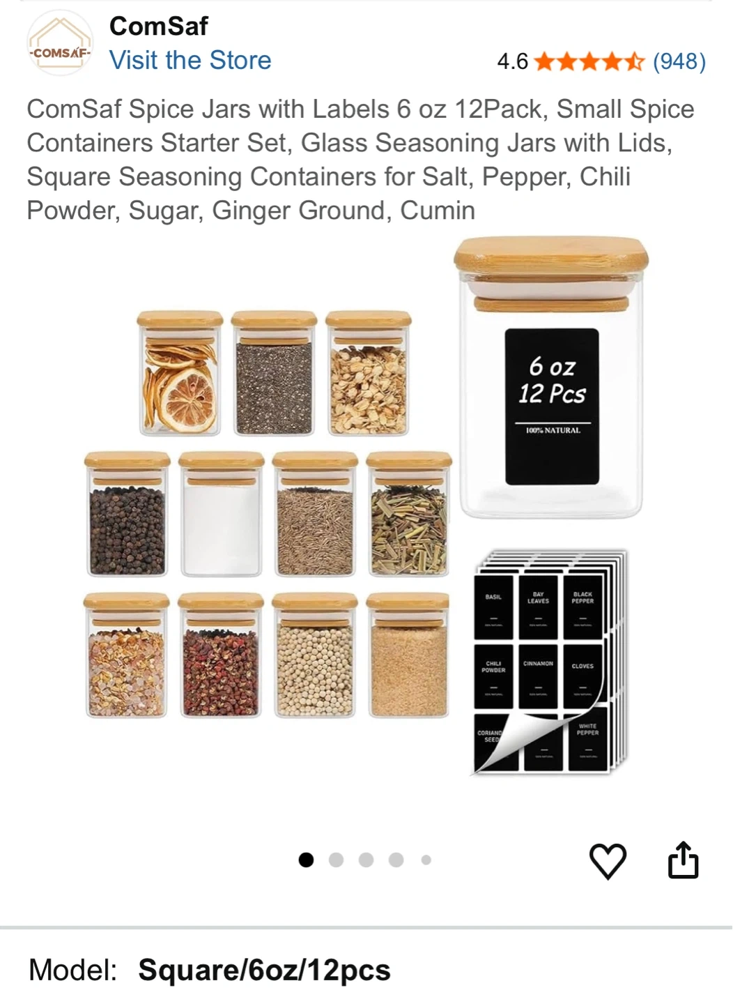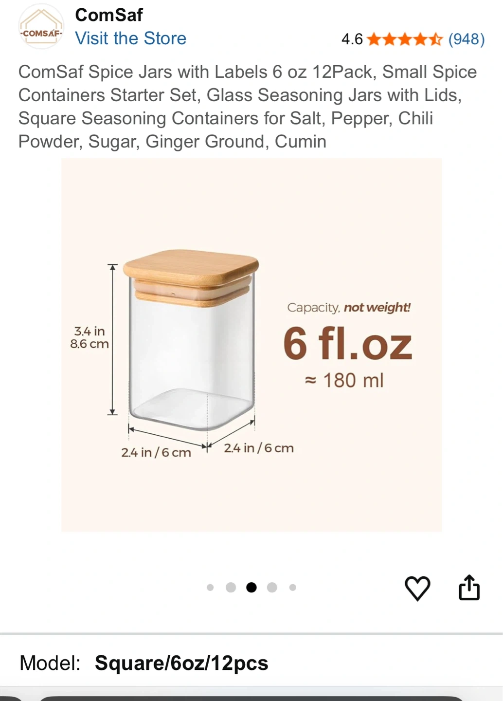 This is a 12-pack of 6 oz glass spice jars with bamboo lids and labels. They're square-shaped and great for organizing your kitchen or pantry. Each jar has a capacity of approximately 180 ml.