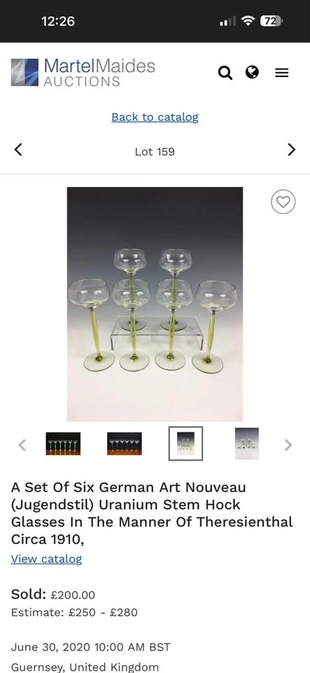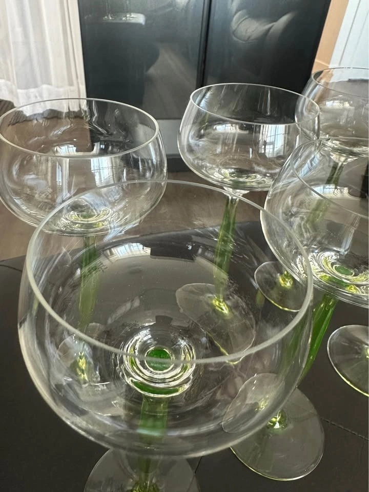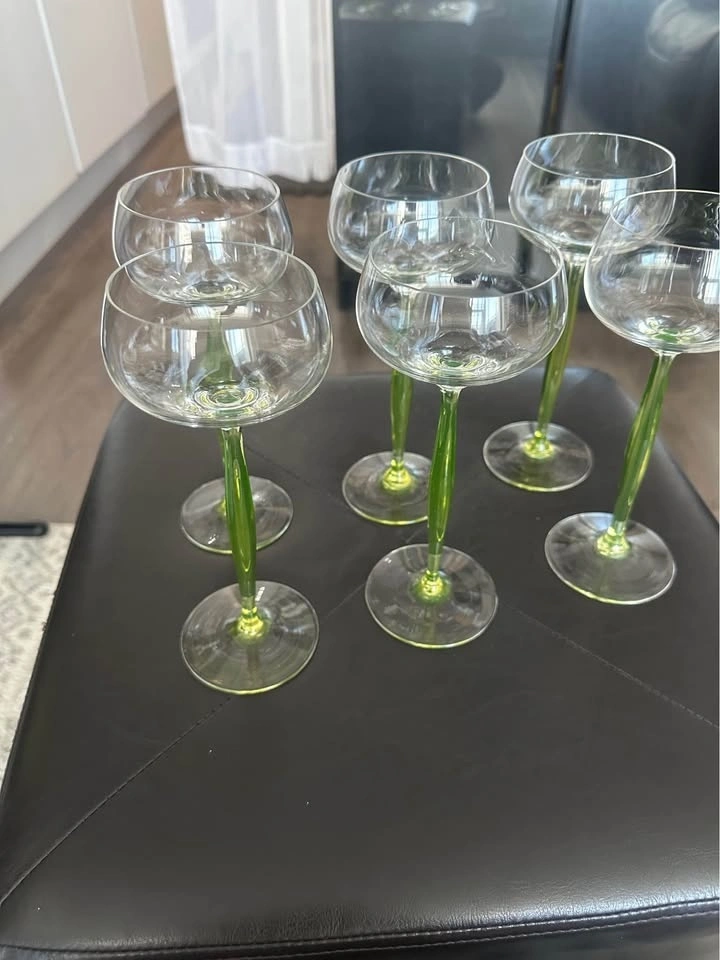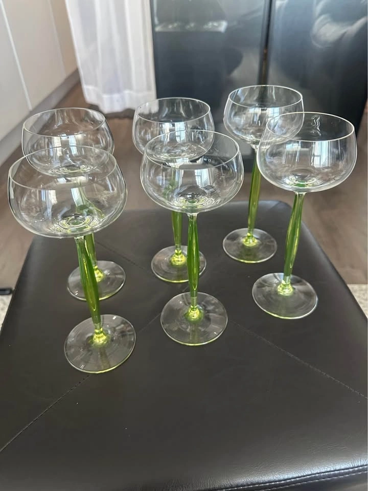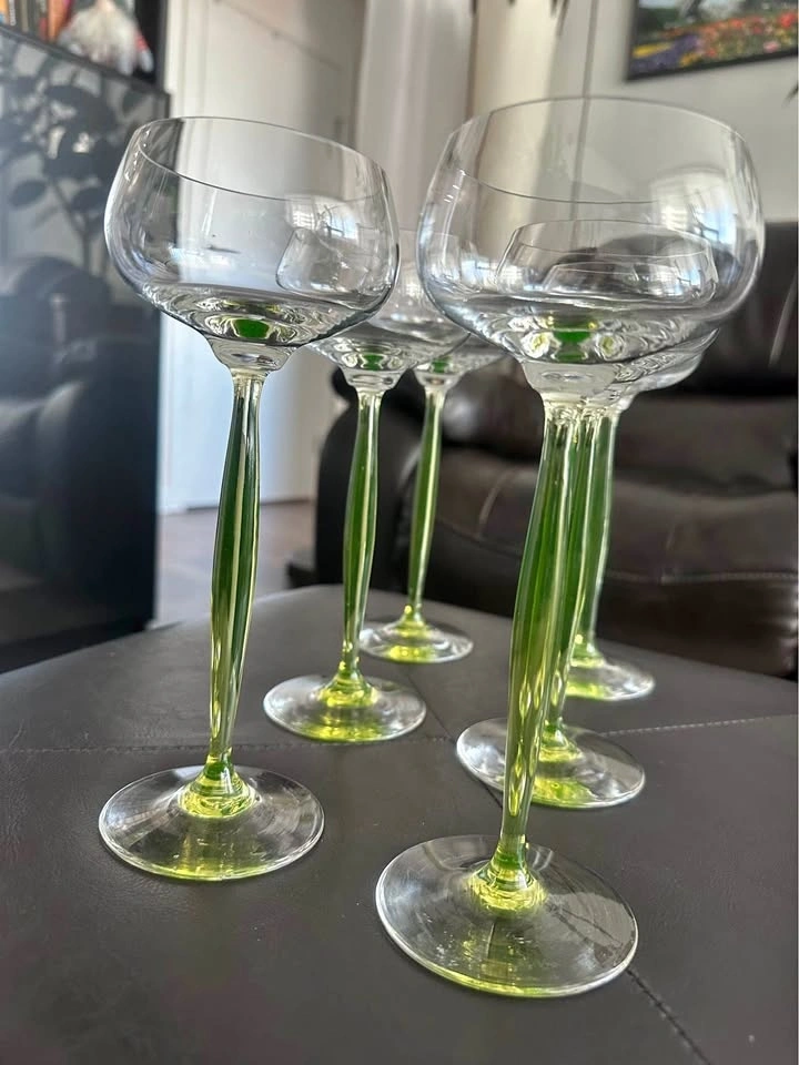 Elegant vintage Art Deco uranium glass wine glasses with rare chartreuse green stems. These are classic hock / roemer (cordial) glasses, highly sought after by collectors of early 20th-century European glass. The glasses feature air-blown, opalescent uranium glass stems that glow under UV light, paired with clear rounded bowls — a timeless and very refined silhouette. Style: Art Deco / Art Nouveau transition. Era: Early 20th century (circa 1900–1920). Origin: France (attributed style). Material: Uranium glass (green stems). Type: Hock / Roemer / Cordial glasses. Quantity: Set of 6. Stem color: Chartreuse green. Technique: Air-blown stems. Condition: Excellent vintage condition, no chips or cracks. These glasses are versatile and can be used for wine, cocktails, champagne, or cordials, but they also display beautifully as a collector’s set. Similar designs have been attributed to designers such as Hans Christiansen for Theresienthal, reflecting the refined European glassmaking tradition of the period. Please message with any questions.