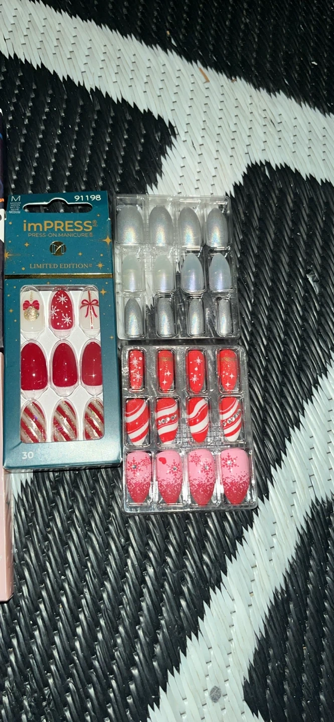 Get festive with these press-on nails! Includes Glamnetic solid black, Glamnetic skeleton, DO-IT-YOURSELF Halloween designs with spiders and pumpkins, and imPress Limited Edition holiday sets with candy cane, snowflake, and bow designs. Easy to apply for a quick festive look!