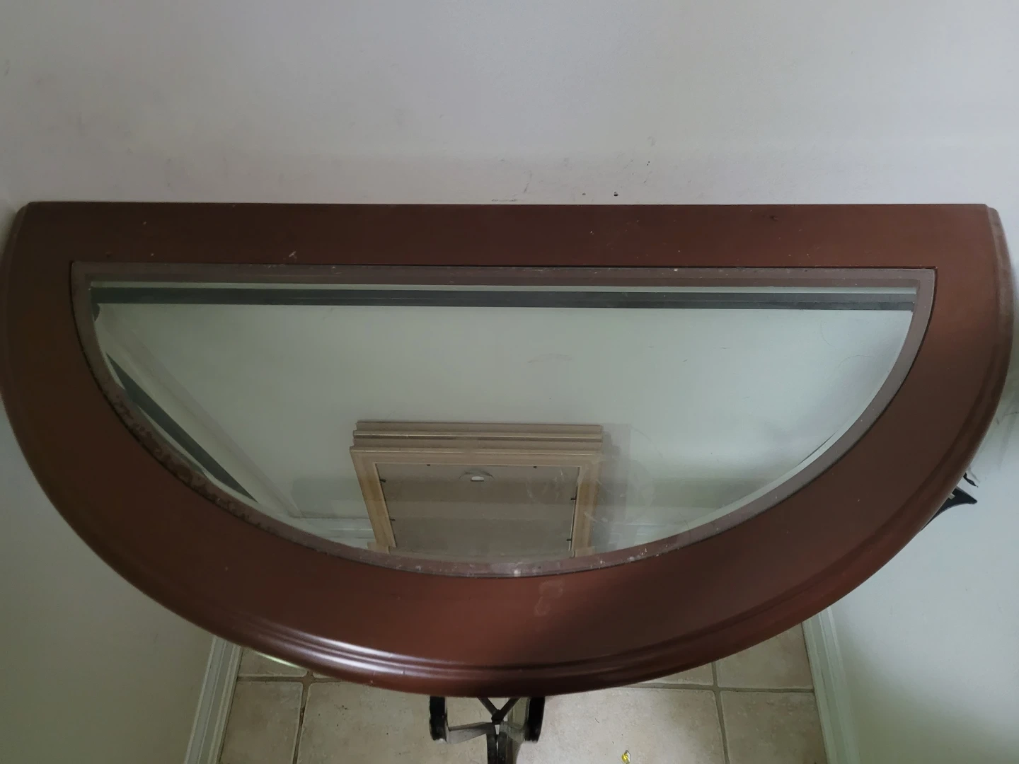 This console table features a rich wooden top with a curved edge, supported by an ornate black metal base. It's a stylish accent piece for your entryway or living room. Dimensions: 32"H x 37" W x 17" D.