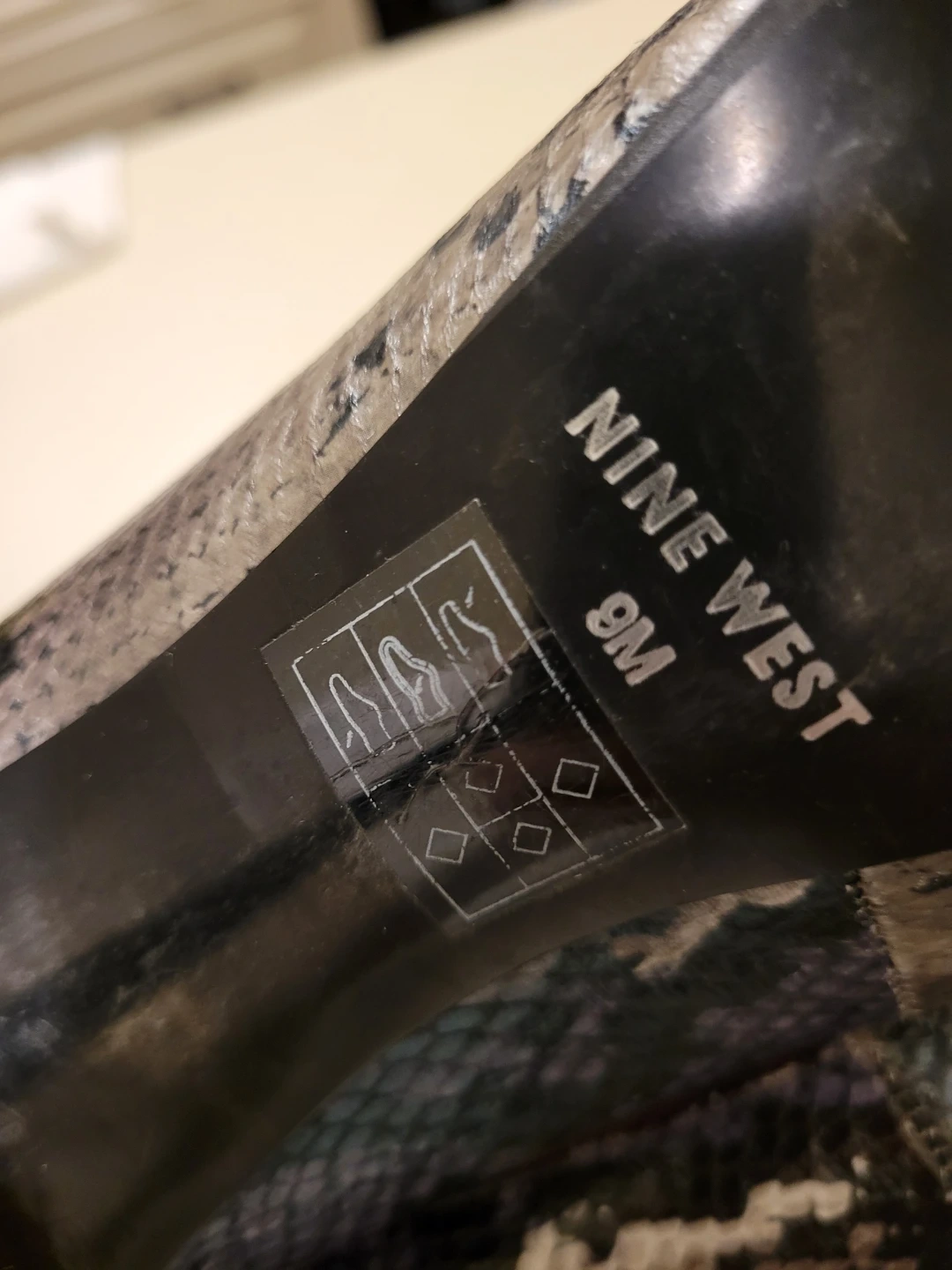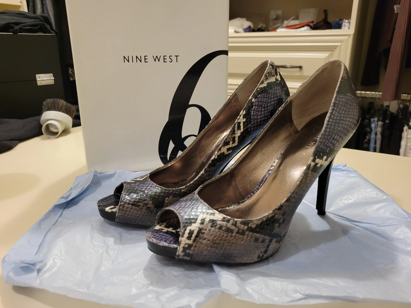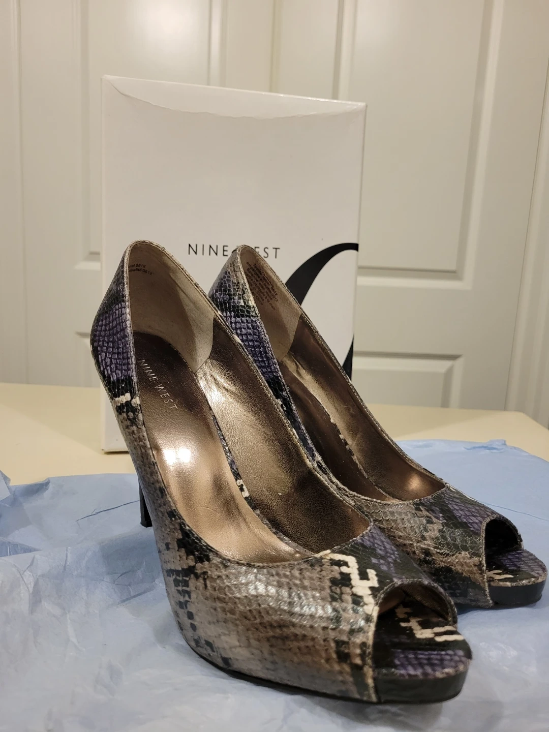 These Nine West peep-toe heels feature a snakeskin print in grey, black, and purple. Size is 9 medium. Original box included.