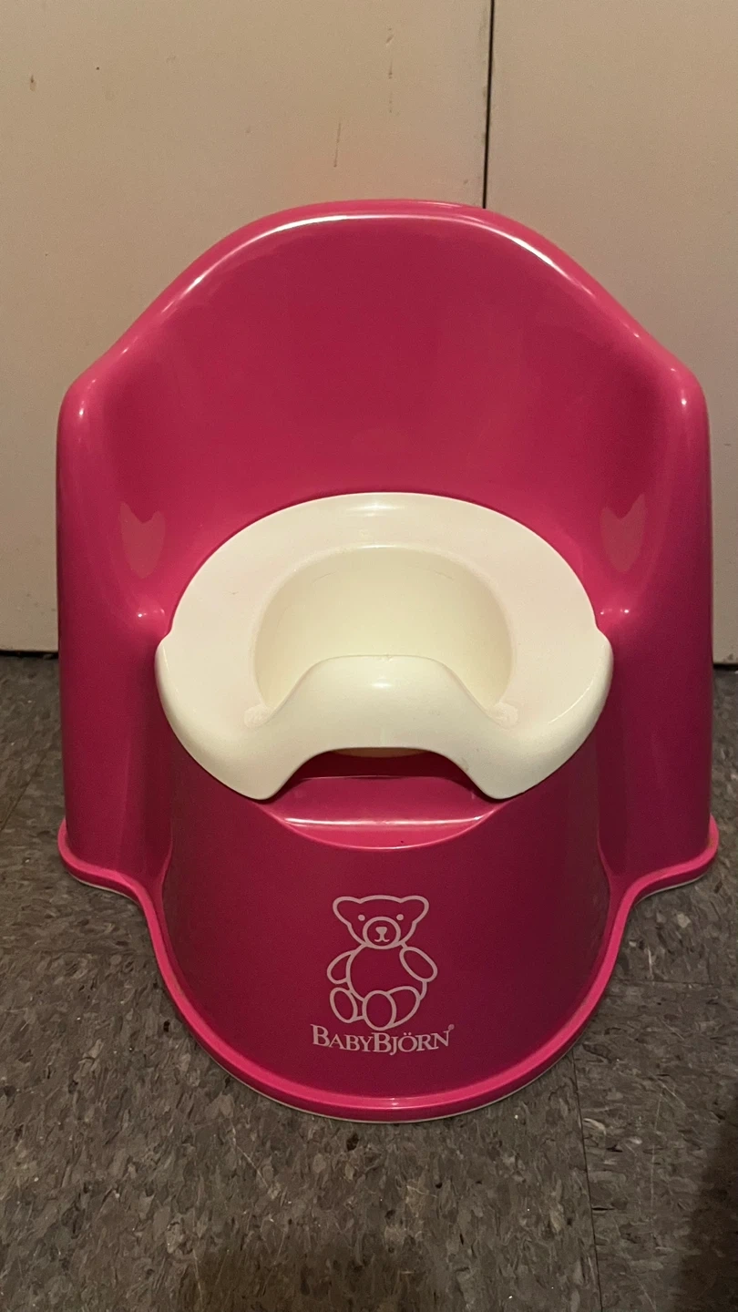 This is a BabyBjörn potty chair in pink. It's designed for toddlers learning to use the toilet. Made of durable plastic, it's easy to clean and has a comfortable seat.