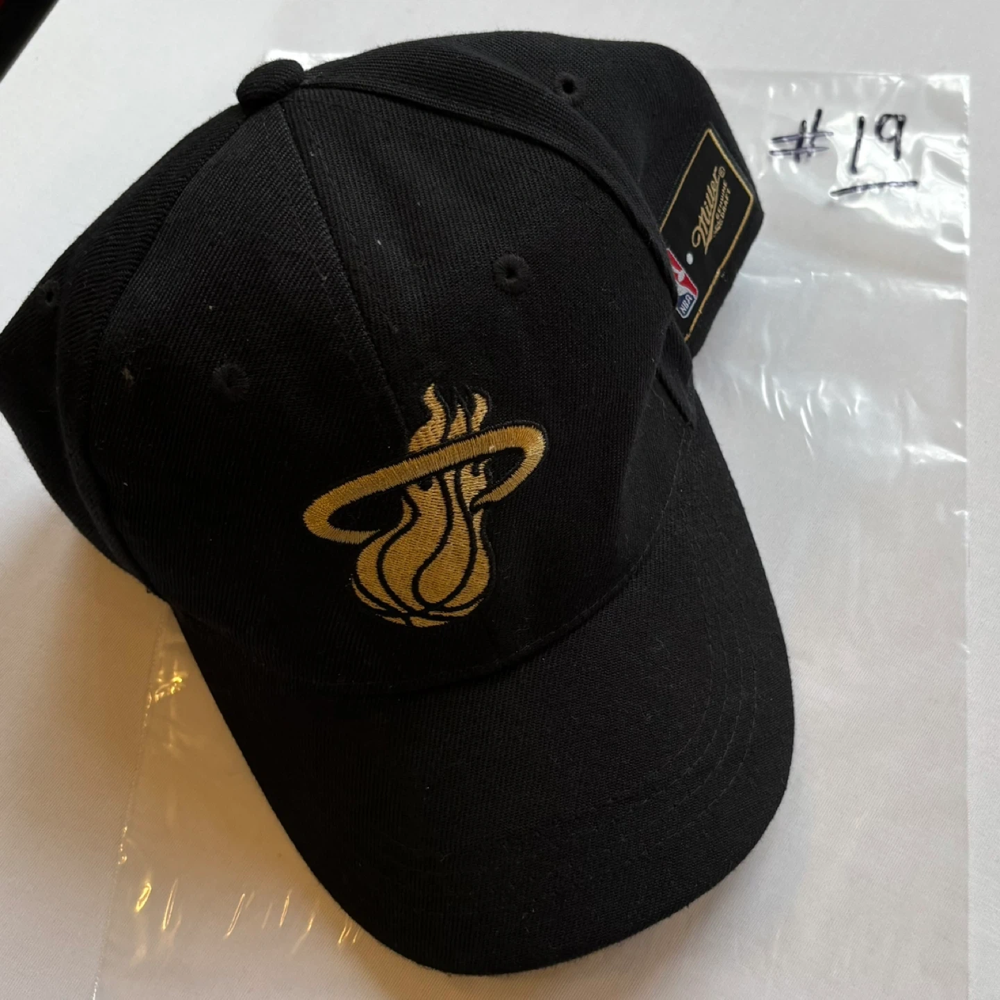Show your team pride with this Miami Heat NBA Snapback Cap. The hat features the iconic flaming basketball logo embroidered in striking gold thread against a classic black background. This specific edition has a Miller Genuine Draft official patch near the snapback closure, making it a unique piece of NBA memorabilia or fan gear. It has a sturdy, flat brim and an adjustable snapback design for a comfortable, One Size Fits Most fit. Perfect for game day, casual wear, or any Heat fan!