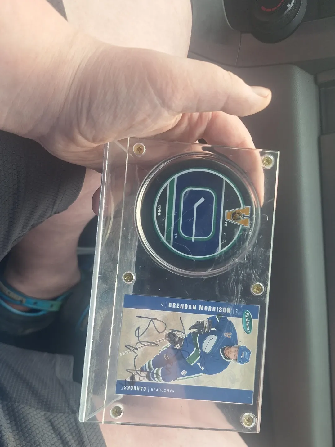 This is a signed hockey puck and trading card display featuring Brendan Morrison of the Vancouver Canucks. It includes a puck with the Canucks logo, a Parkhurst trading card with Morrison's autograph, and both are housed in a clear protective case. This piece is a great collectible for any Canucks fan!