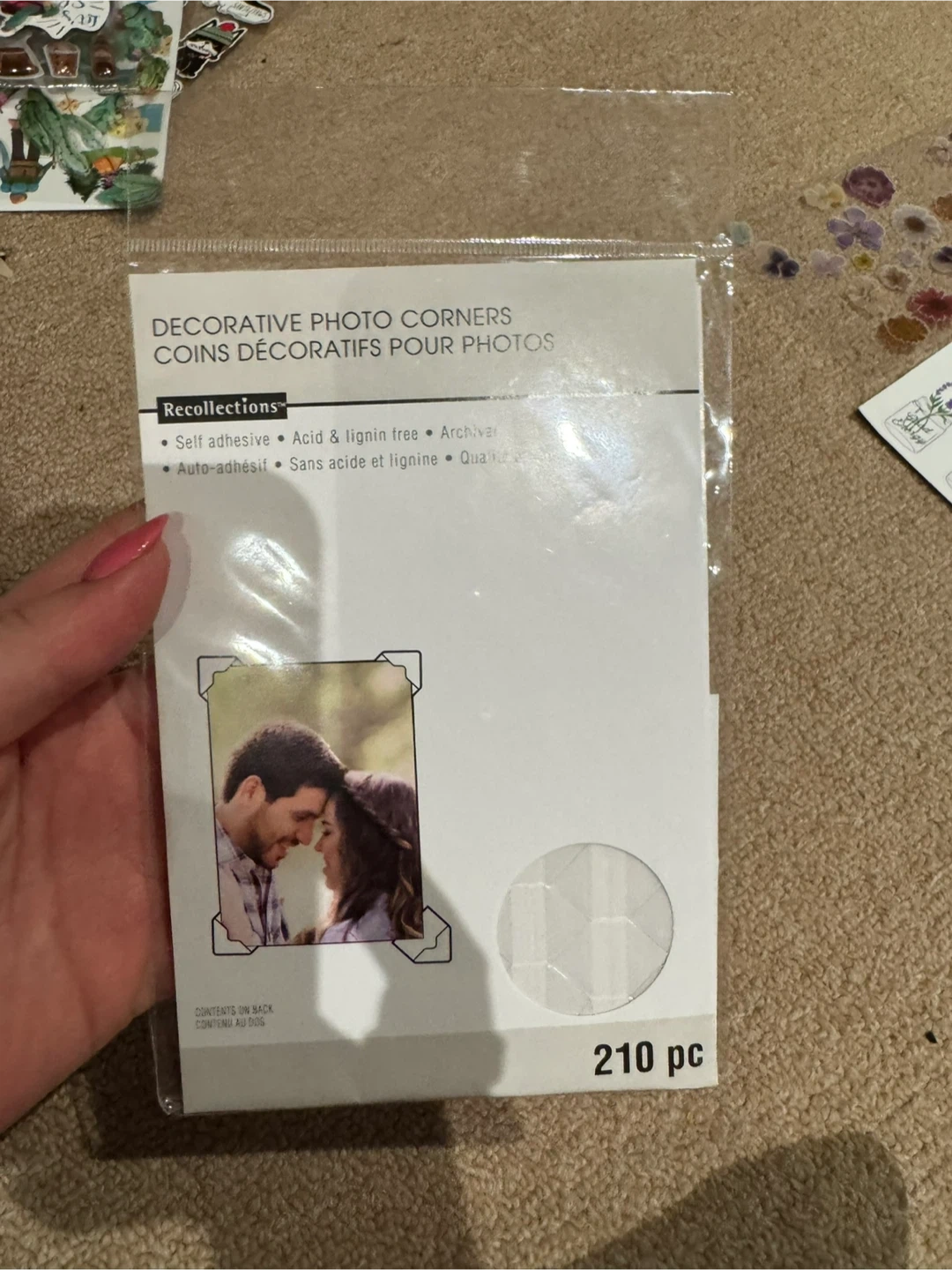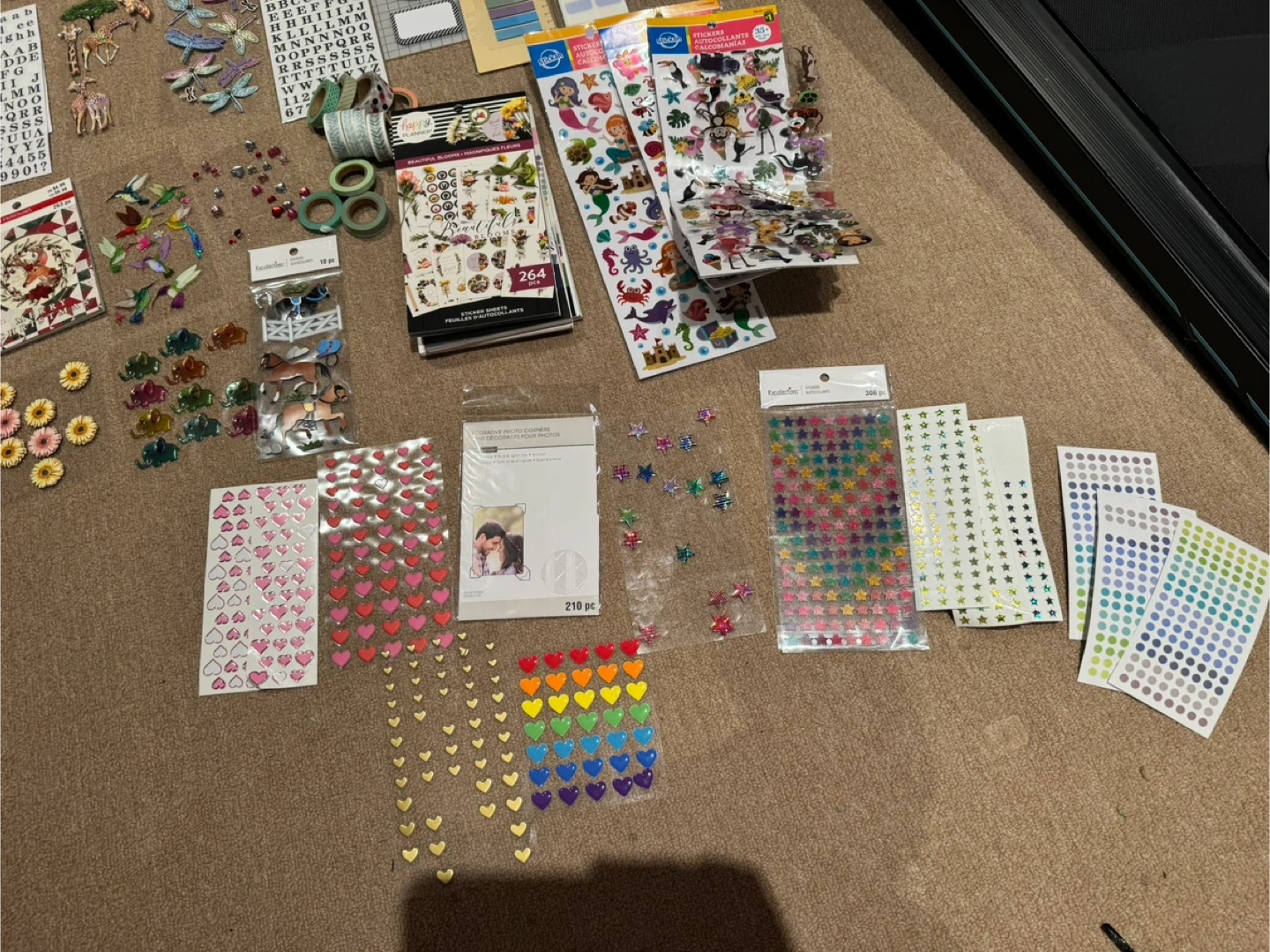 This lot includes a wide variety of stickers, decorative tape, photo corners, an ink pad, and a tape glue runner. Stickers feature themes like flowers, animals, letters, and planner designs. All items are new or in excellent condition, perfect for scrapbooking, journaling, and other crafts. Supplies are from brands like Recollections and AdTech.