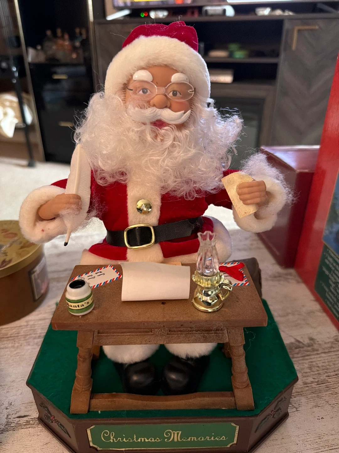 Selling a Christmas Memories animated Santa figure. It features Santa at his desk, writing letters. A charming addition to your holiday decor! And plays music