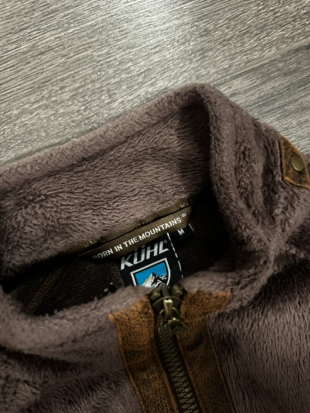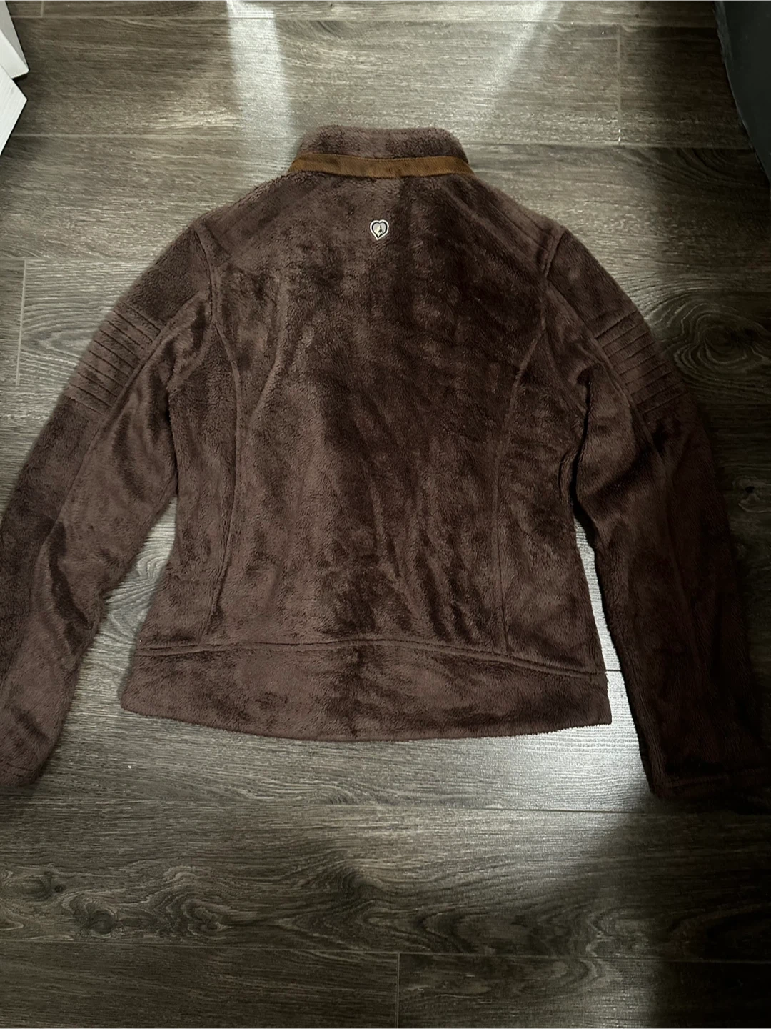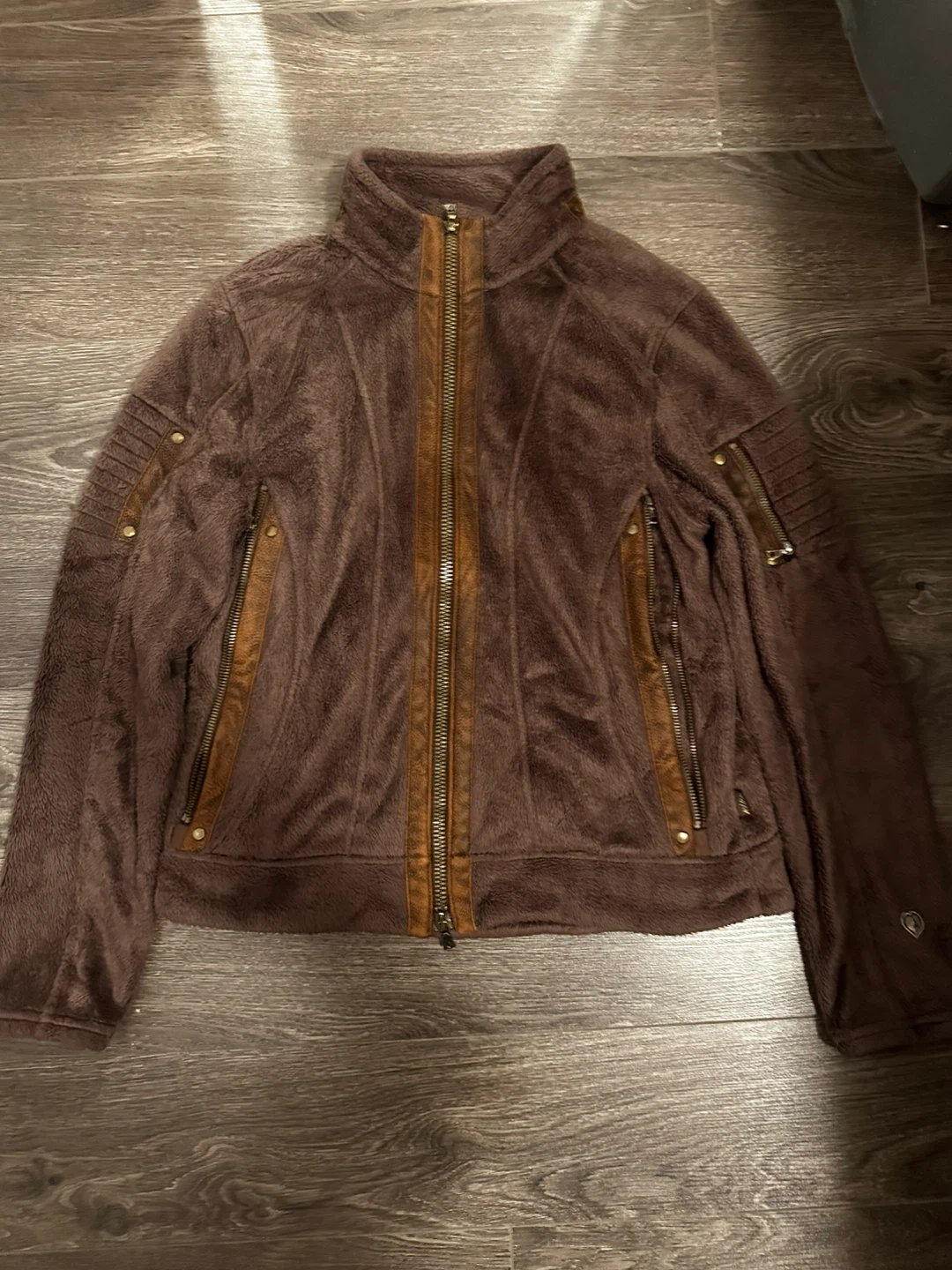 This Kuhl fleece jacket is brown and size medium. It features a full zip front with brown faux leather accents. It's made from a soft, cozy fleece material perfect for cooler weather.