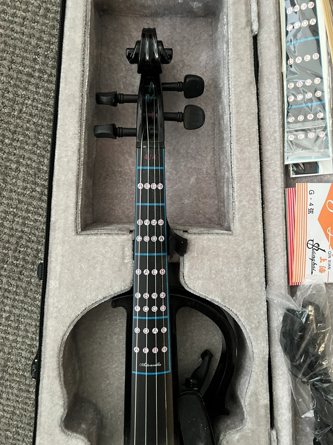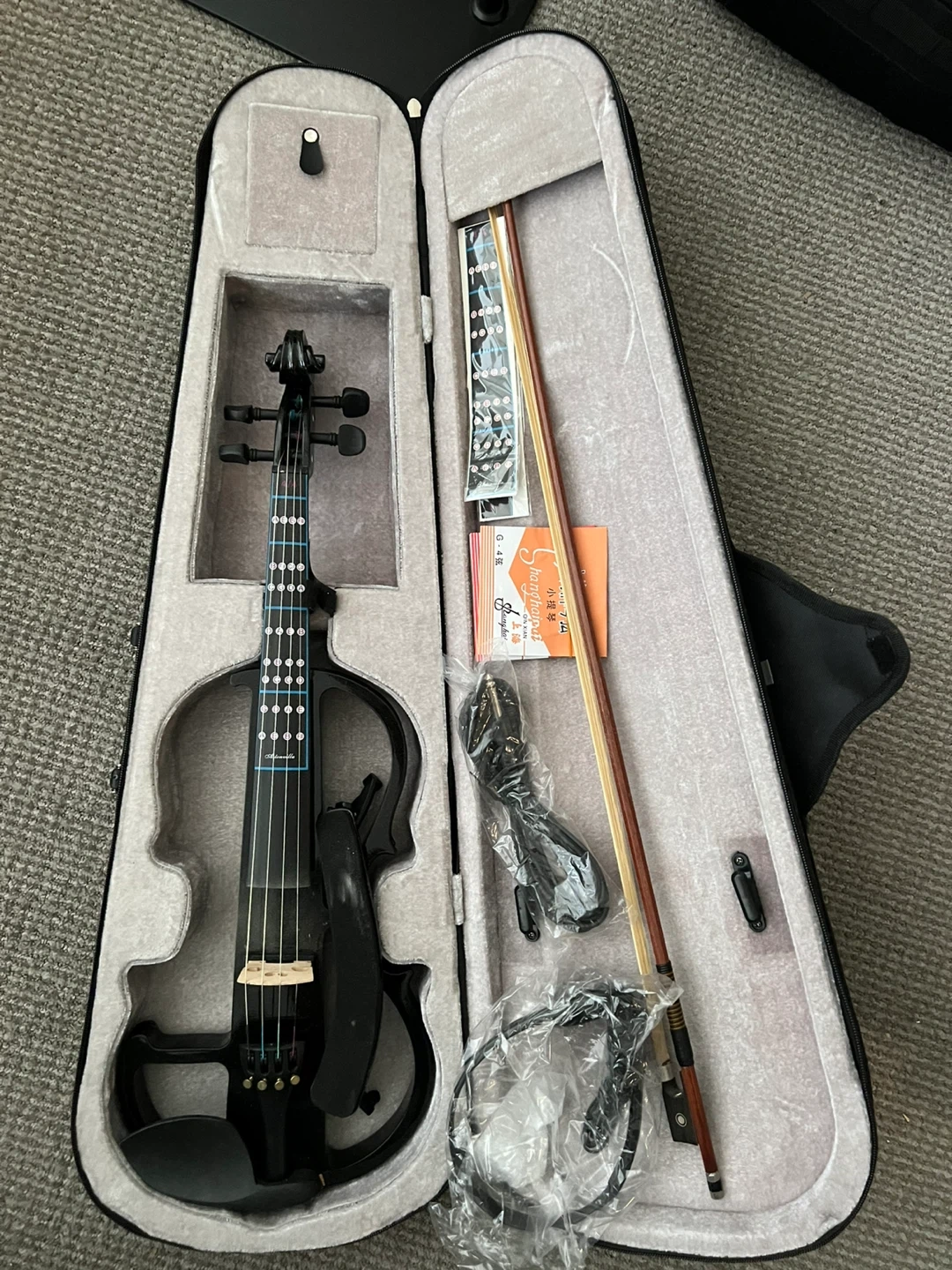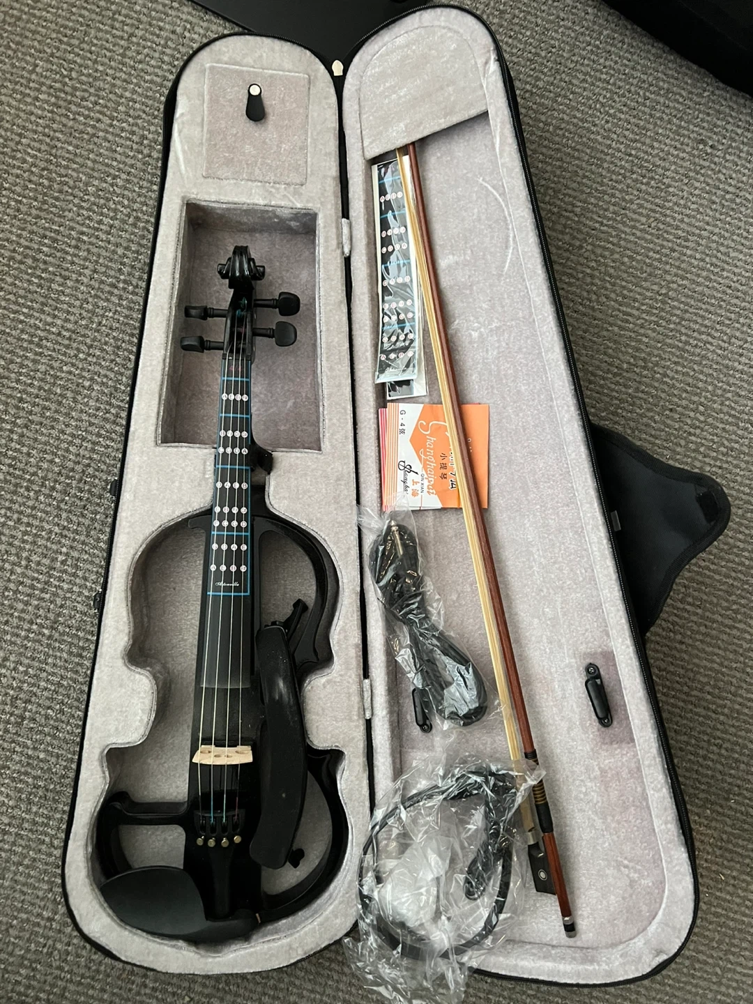 Black electric violin. It's a full-size instrument with volume and tone controls. Includes a bow, headphones, amp cable, case and a 9V battery.