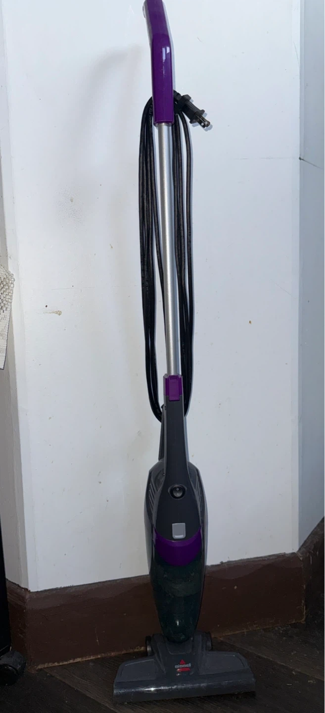 This is a purple and grey Bissell stick vacuum cleaner. It's corded and comes with its power cord. It's a handy vacuum for quick cleanups! ONLY PICK UP