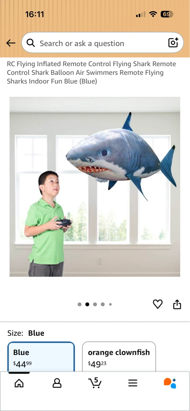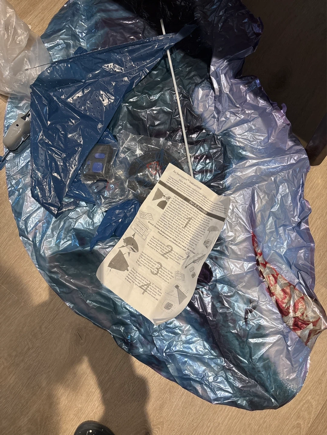 This is a blue RC flying inflatable shark balloon. It's controlled by remote and designed for indoor fun. It comes with the remote and instructions.