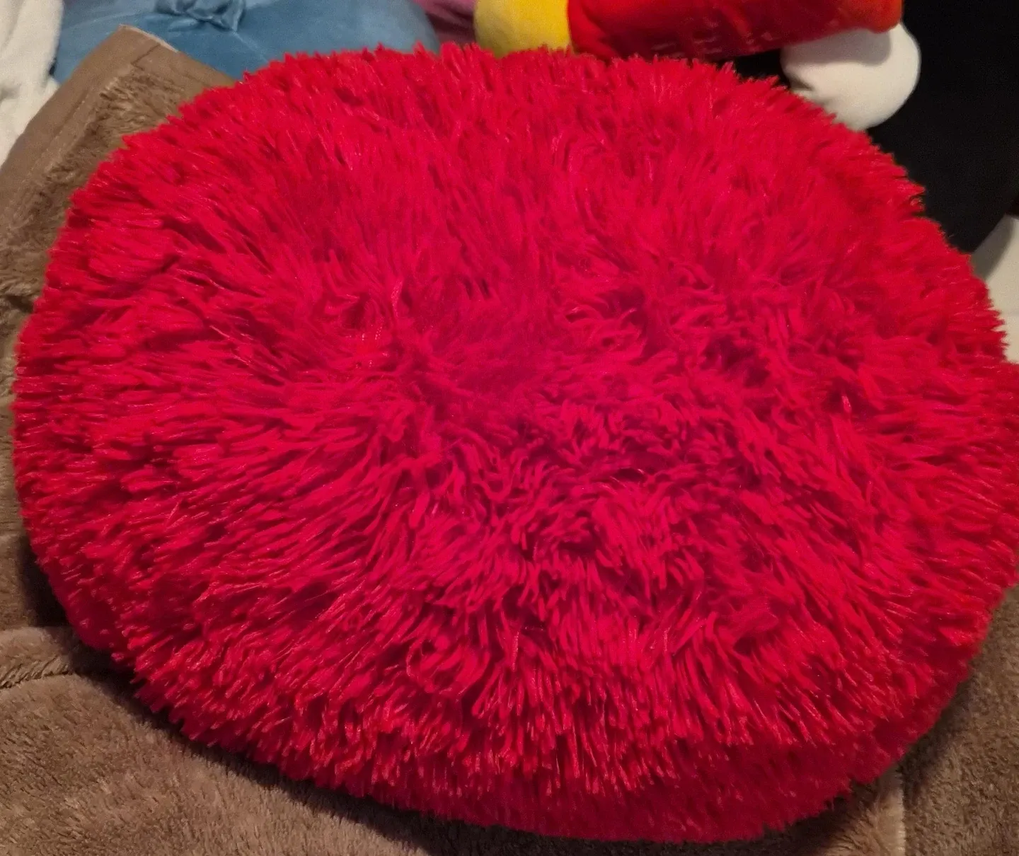 This is a fluffy, round throw pillow in a vibrant red colour. It's made of soft plush material, perfect for adding a cozy touch to any seating area. Great for couches, or to rest your head.