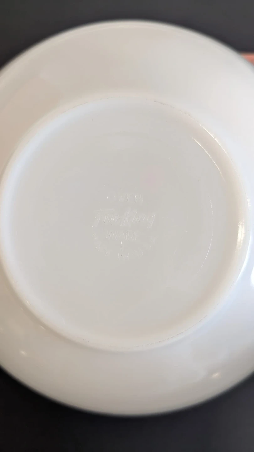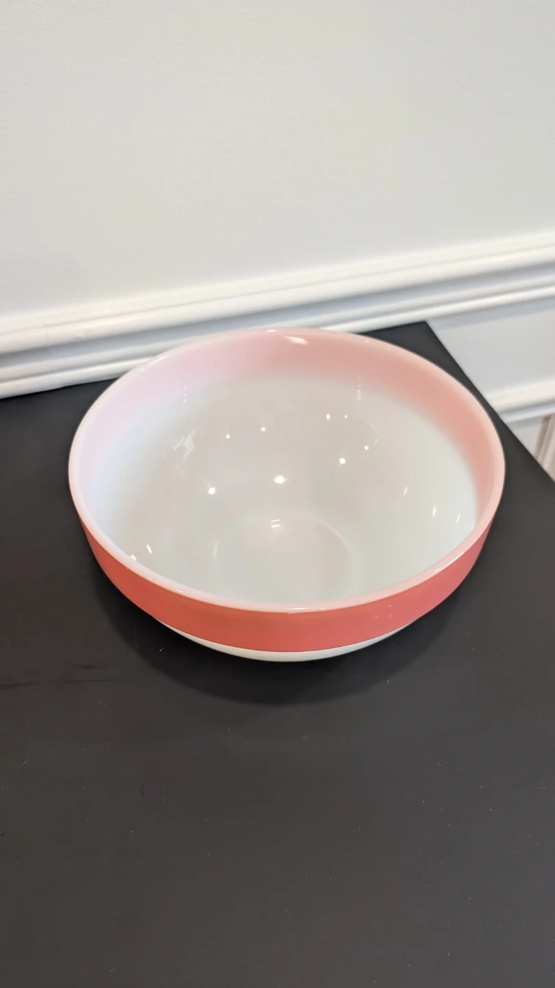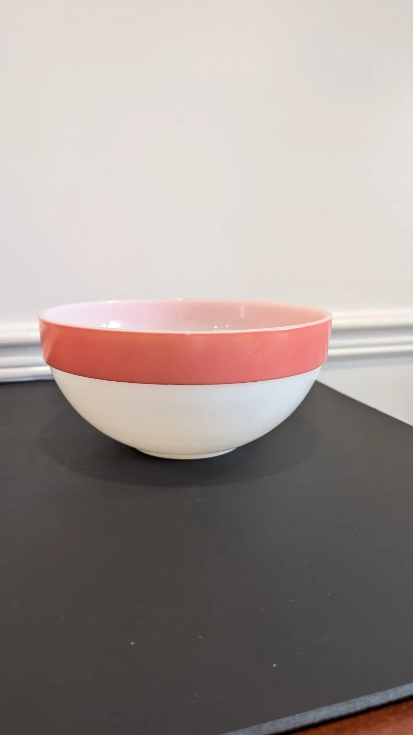 This is a vintage Fire King mixing bowl. It's made of milk glass with a coral pink band around the rim. It's a lovely addition to any kitchen collection!