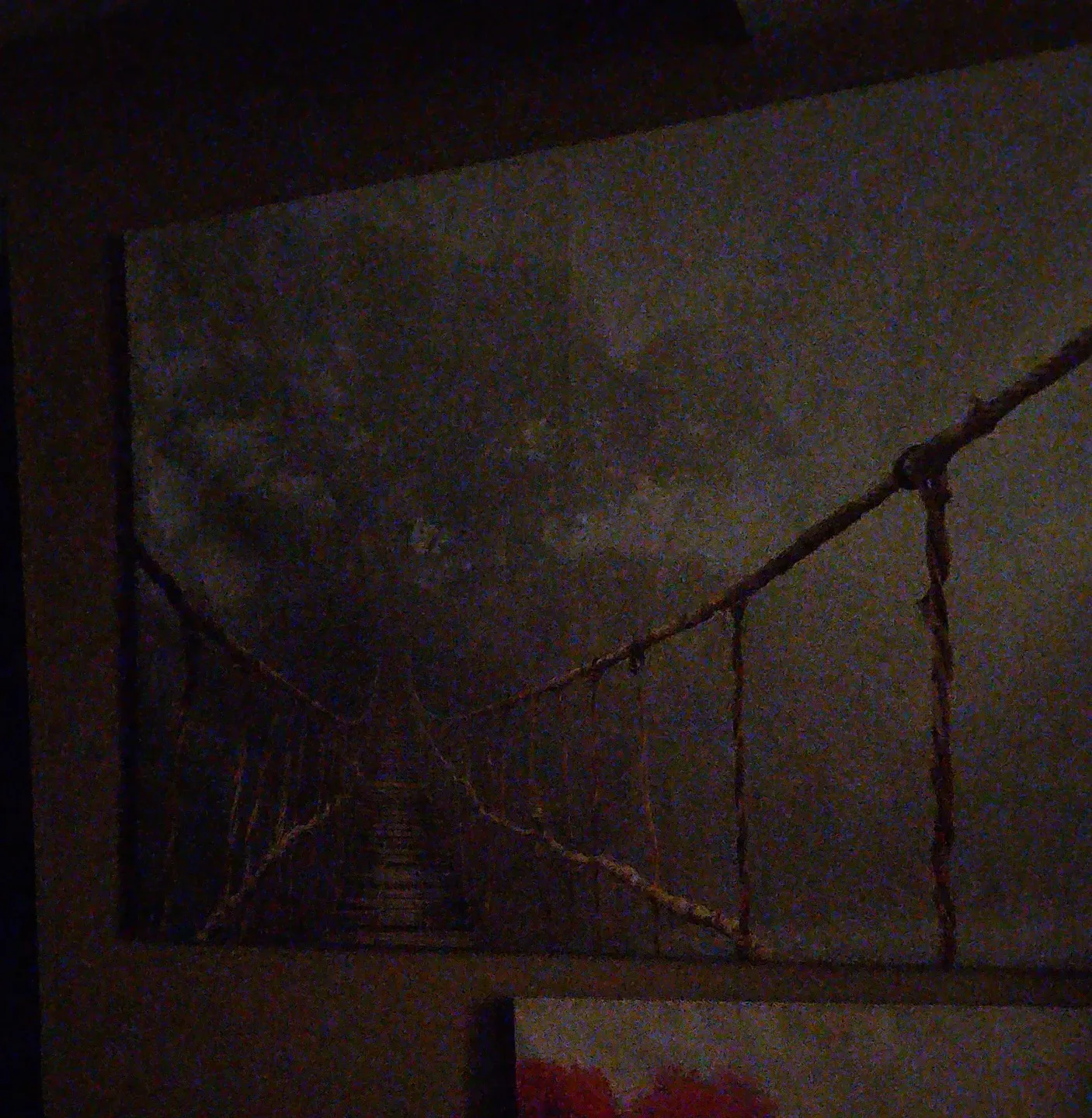 Canvas print featuring a suspension bridge. The artwork depicts a wooden walkway leading into a misty, atmospheric background. It's a striking piece for any wall!
