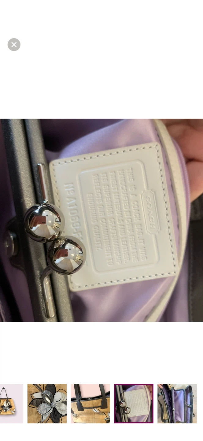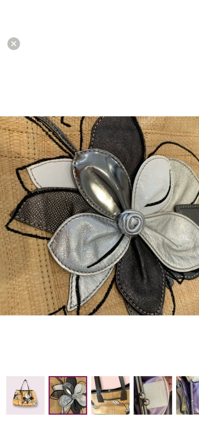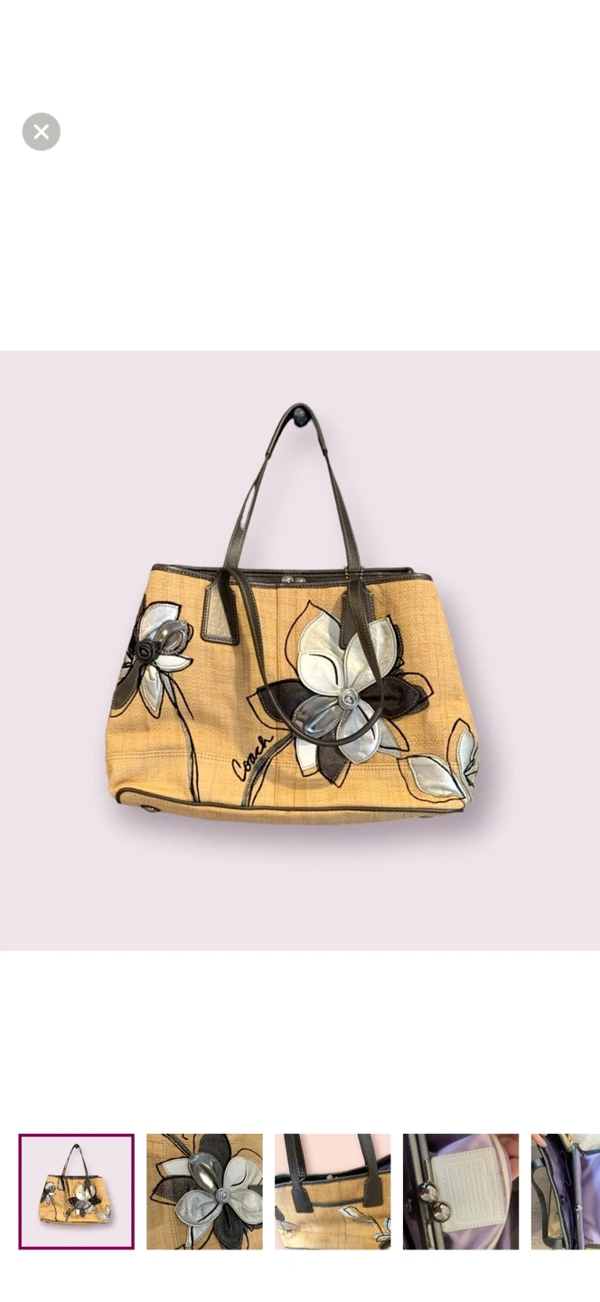 Selling a Coach tote bag with a straw exterior and floral applique design! The interior is a lovely lavender colour. The bag features black leather trim and silver hardware. Perfect for adding a touch of style to your outfit