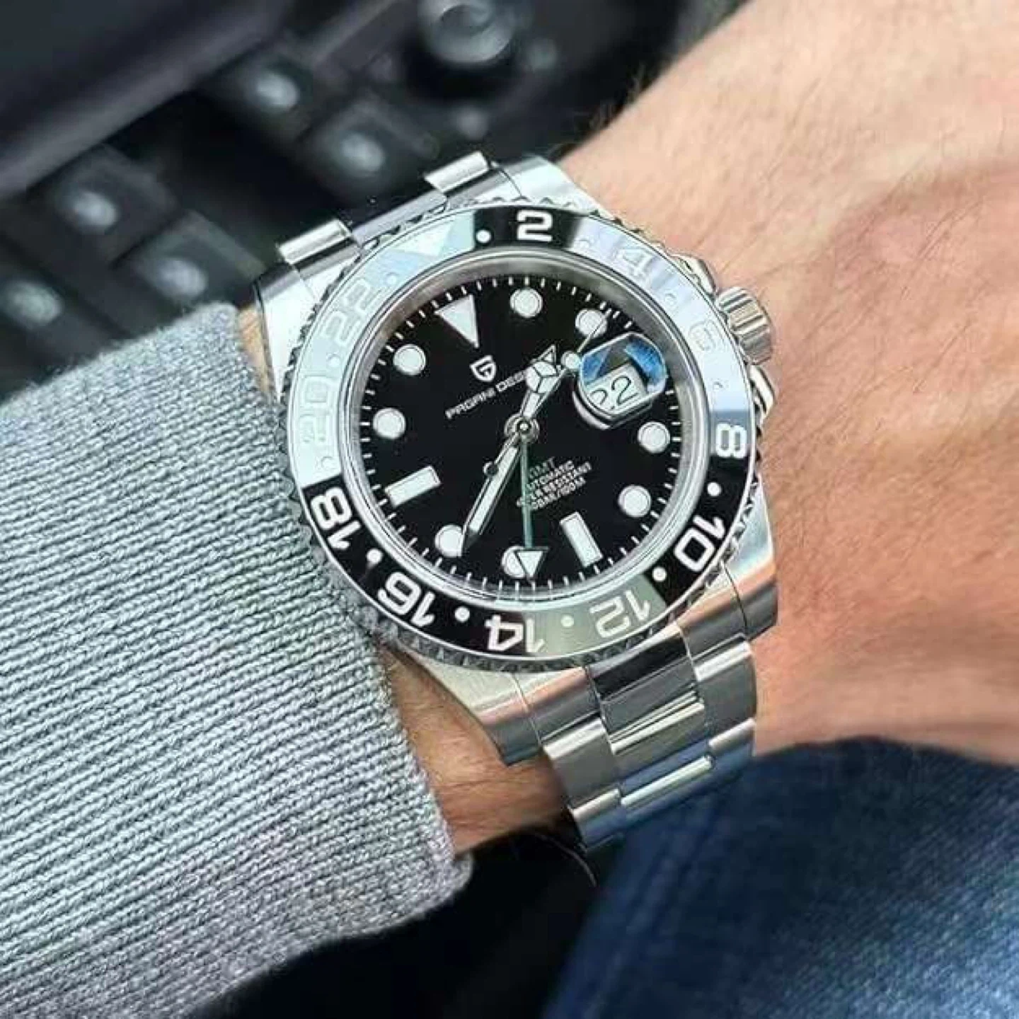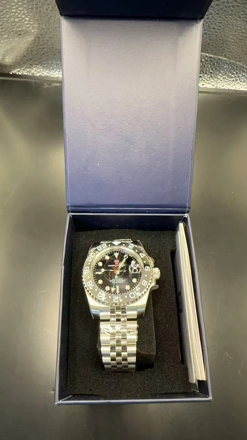 Pagani Design PD-1622 automatic GMT watch with a 40mm stainless steel case. It has a synthetic sapphire glass dial window and a water resistance of 100M. Includes original gift box, user manual, and warranty card.