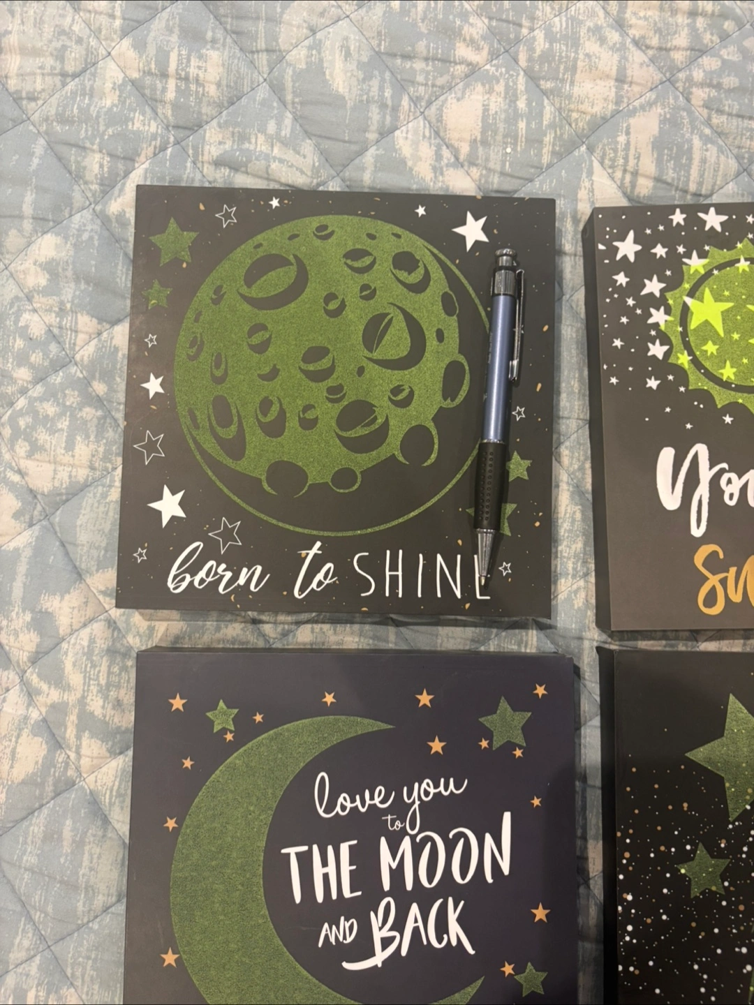 Four square decorative wall art prints featuring celestial themes. Each print has a unique design with moons and stars, some with inspirational phrases. These are perfect for adding a touch of whimsy to a nursery or child's room.