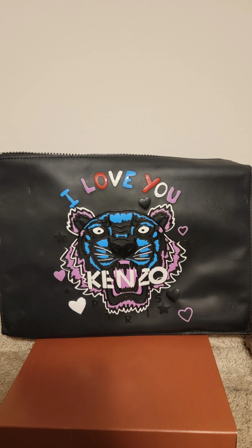 This KENZO clutch pouch features the iconic tiger head design with "I LOVE YOU" text. Black faux leather material with colourful 3D embellishments. It's a stylish accessory for carrying your essentials.
