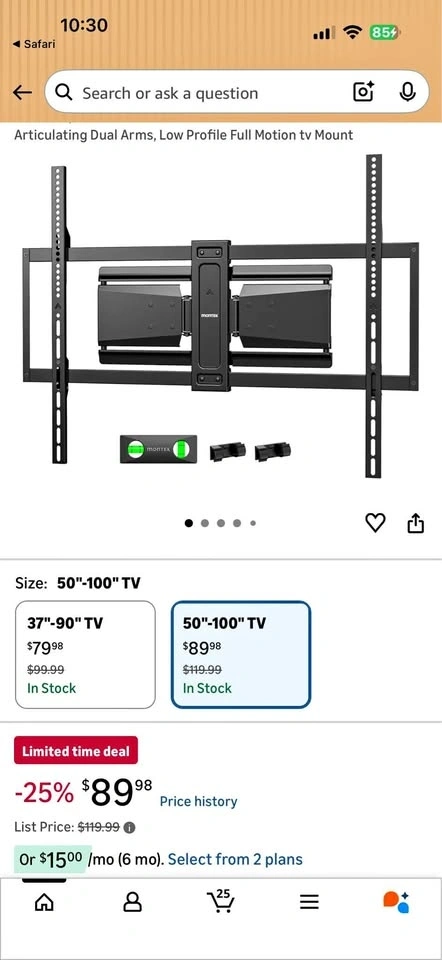 The ultimate viewing experience for your large TV! Premium, slim, and heavy-duty. Price: Only $39. Condition: Open Box - New. Fits: Large TVs from 50" up to 100". Weight Capacity: Heavy-duty, holds up to 185 lbs. Full Motion: Swivel, Tilt, and Extension with Dual Articulating Arms for the perfect angle. Ultra Slim: Low-profile design that looks great on any wall. FREE DELIVERY to: Oak Lawn | Orland Park | Chicago | Crestwood (and nearby).