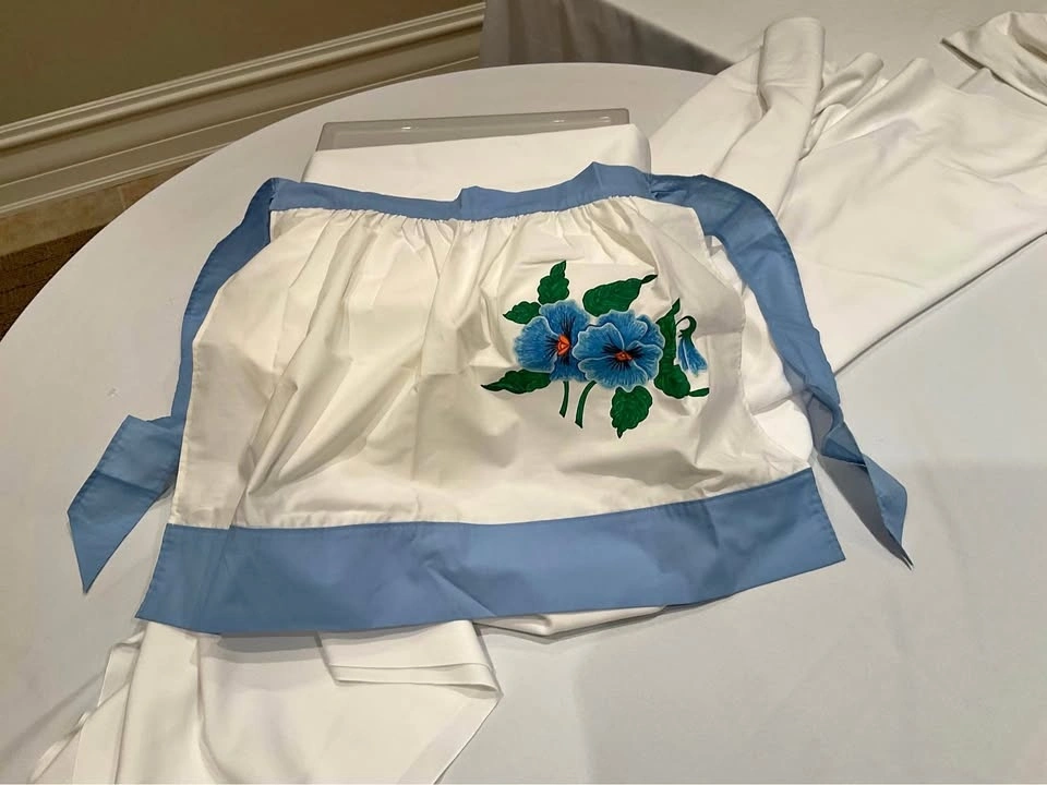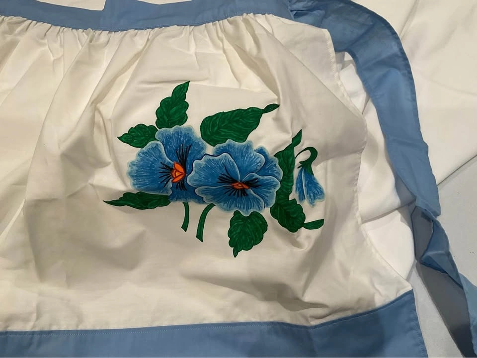 Cute white vintage RETRO apron with pretty blue floral design. Light blue trim and ties. Great for cooking or baking. Mint condition. Smoke-free, pet-free home. Located Richmond Hill Bathurst & King Rd.
