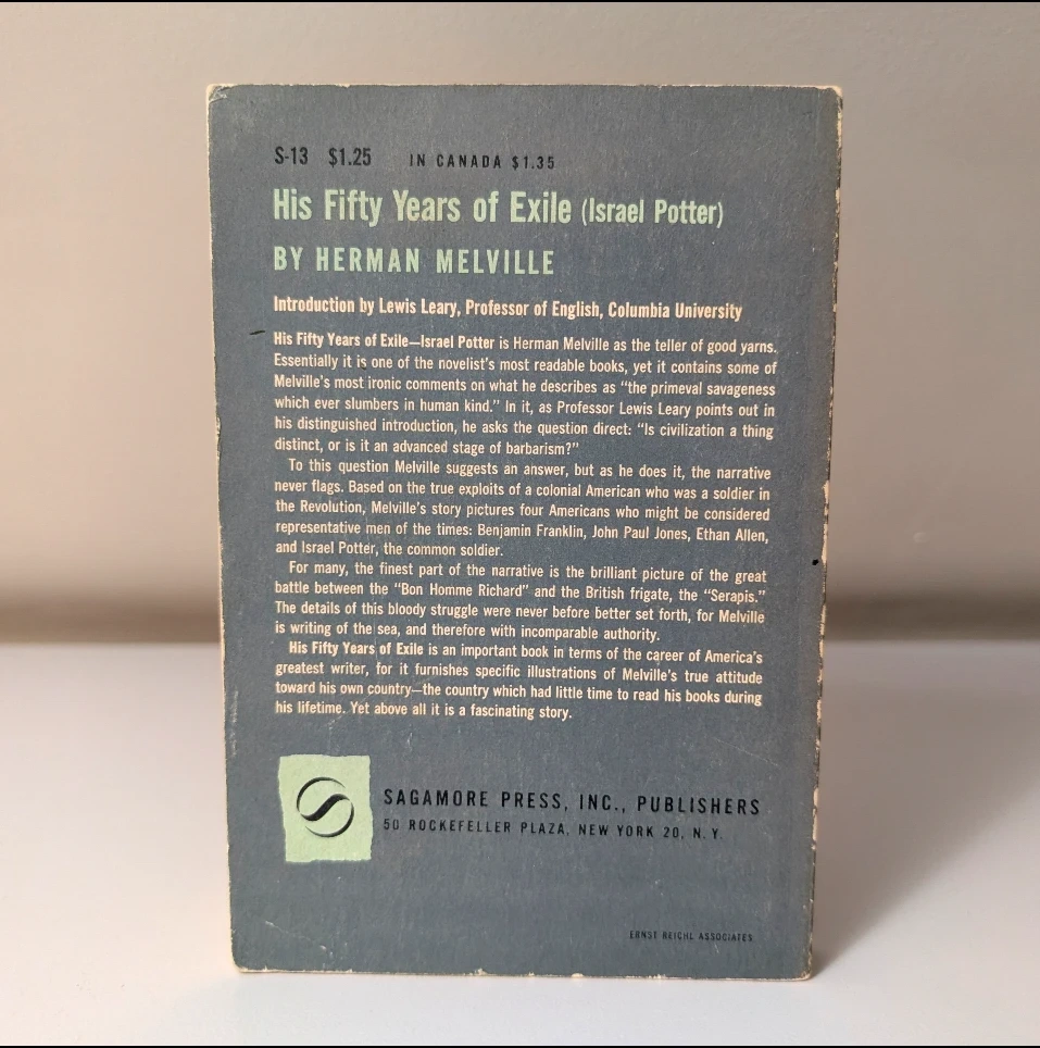 "Israel Potter: His Fifty Years of Exile (1855) is a historical novel by Herman Melville based on the 1824 memoir of a real Revolutionary War veteran. It follows Israel Potterβs journey from fighting at Bunker Hill to being captured, escaping, and spending decades in poverty in London, serving as a spy, and interacting with figures like Benjamin Franklin and John Paul Jones."