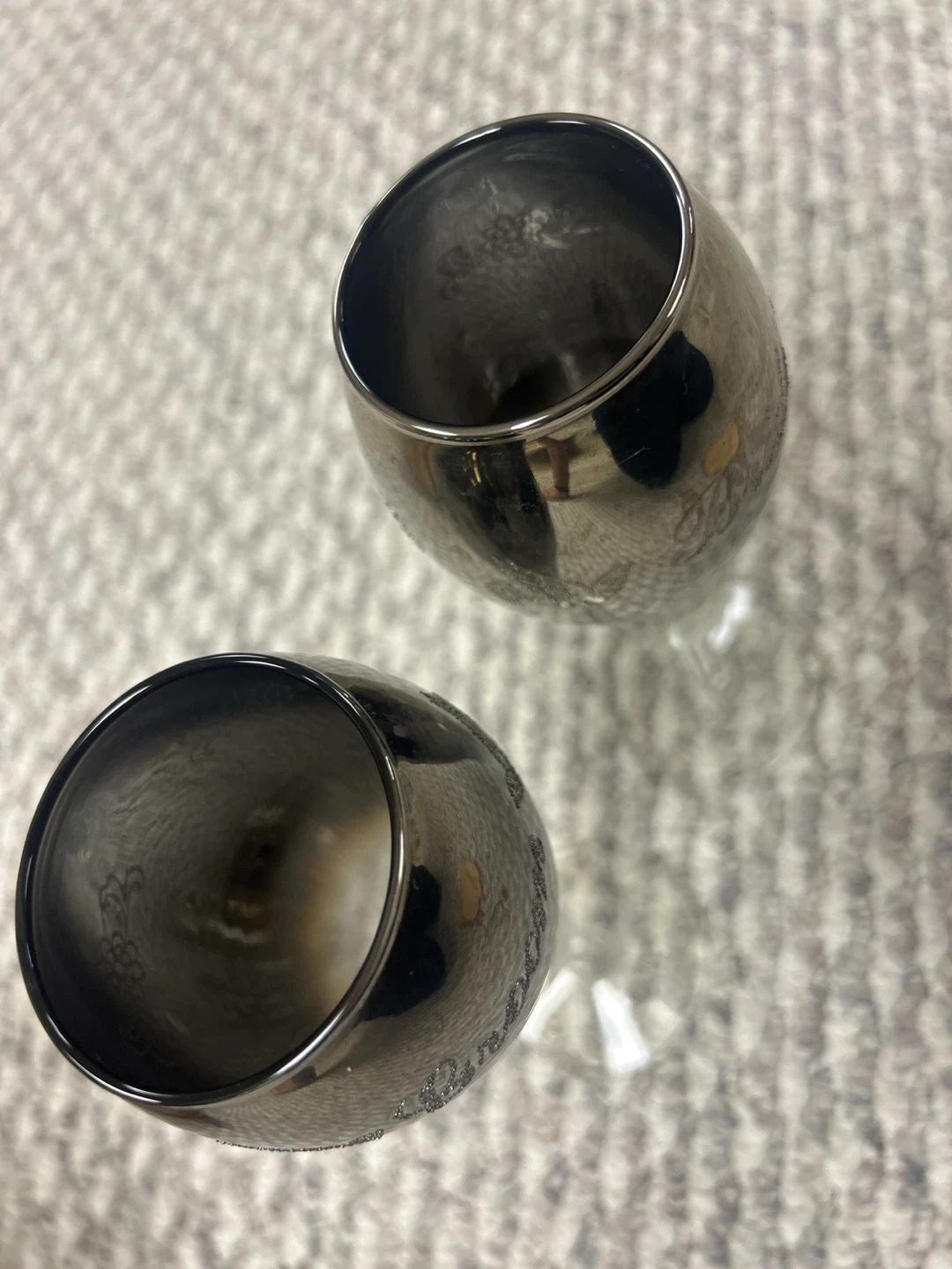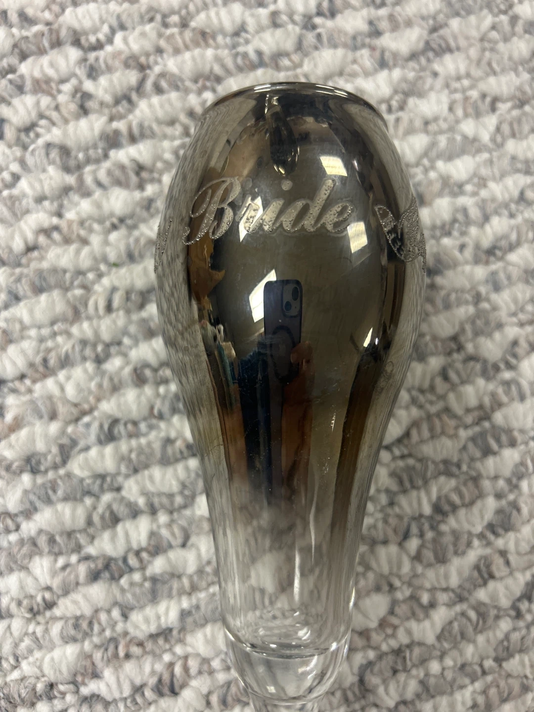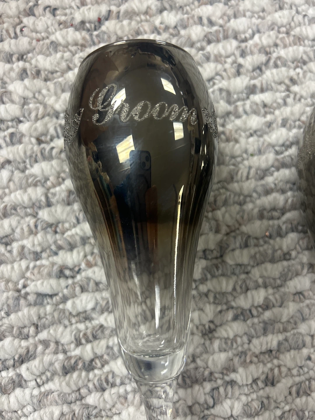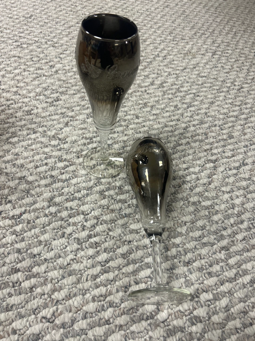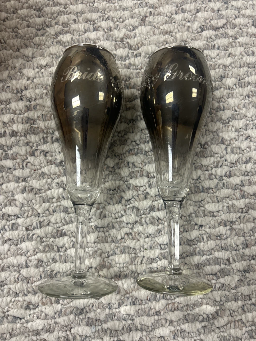 Set of two champagne flutes, one labeled 'Bride' and the other 'Groom'. These glasses feature a metallic sheen with delicate glitter accents.
